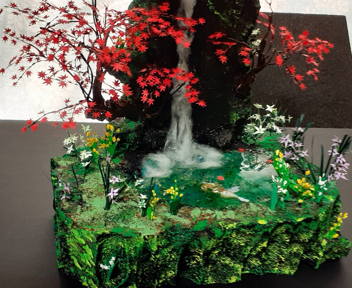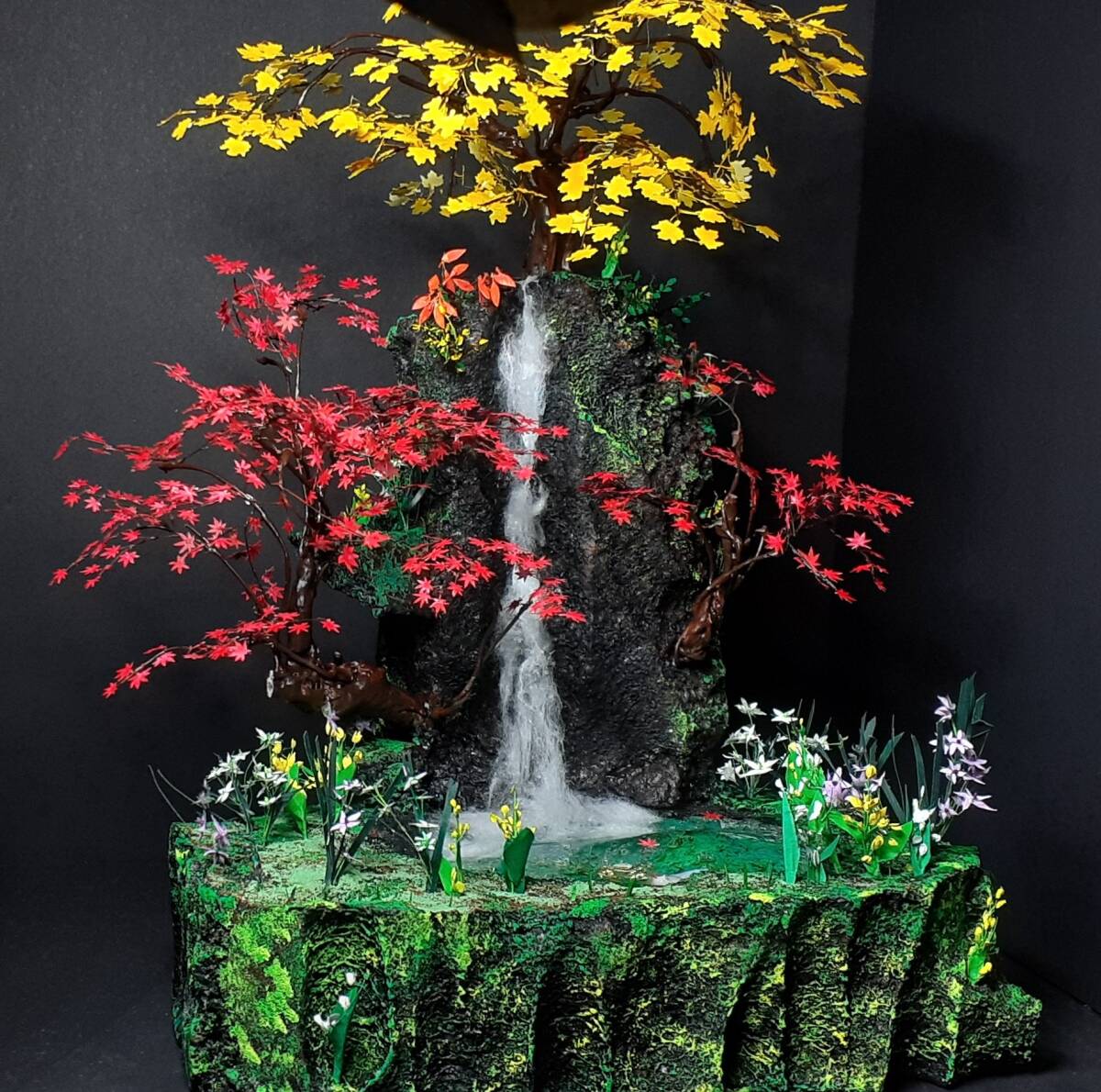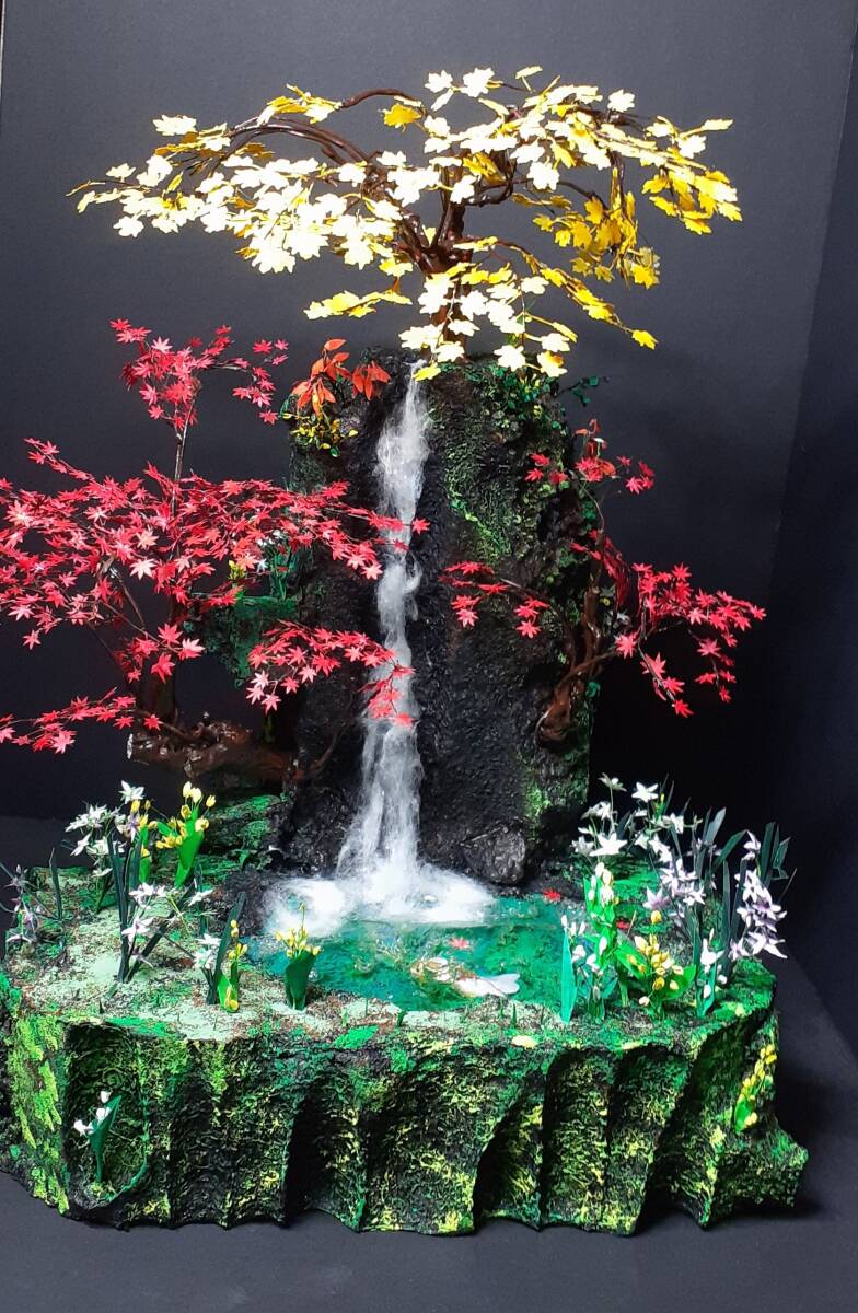 優雅に泳ぎます。その周りには 金蘭、銀蘭、紫センブリなどの可憐な草花が咲き誇っています。美しい秋の情景を切り取ったハンドメイドミニチュア紅葉の滝です。