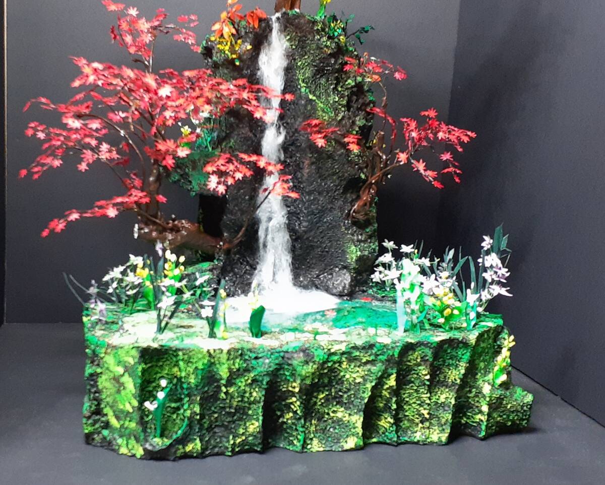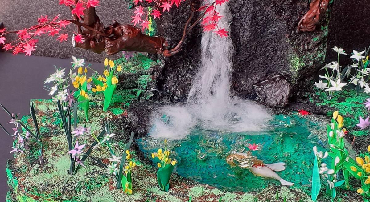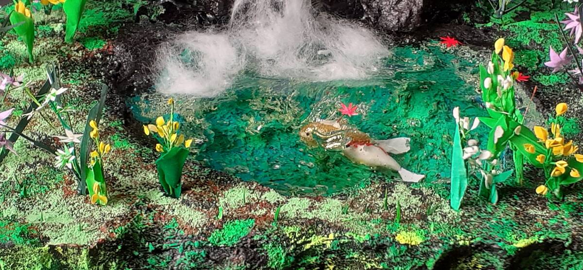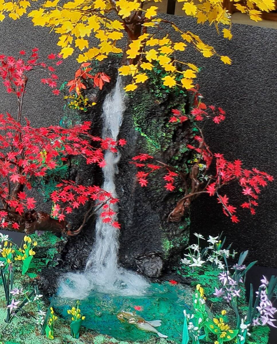 優雅に泳ぎます。その周りには 金蘭、銀蘭、紫センブリなどの可憐な草花が咲き誇っています。美しい秋の情景を切り取ったハンドメイドミニチュア紅葉の滝です。