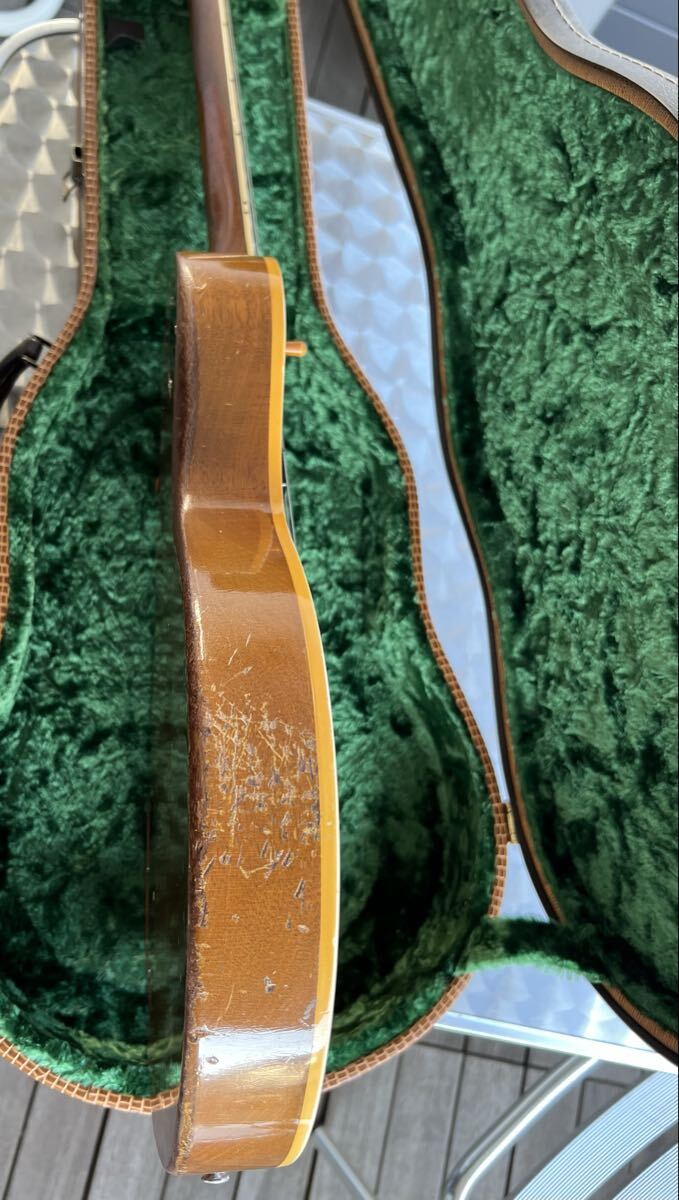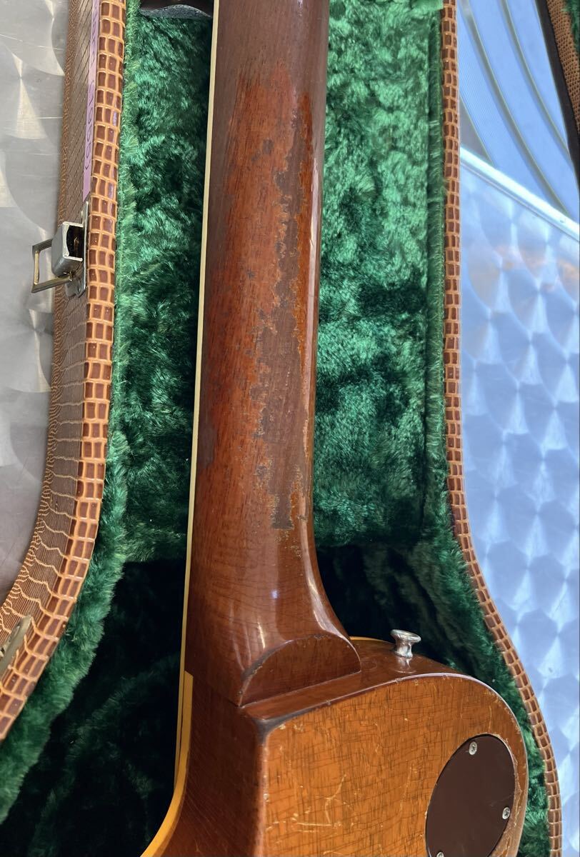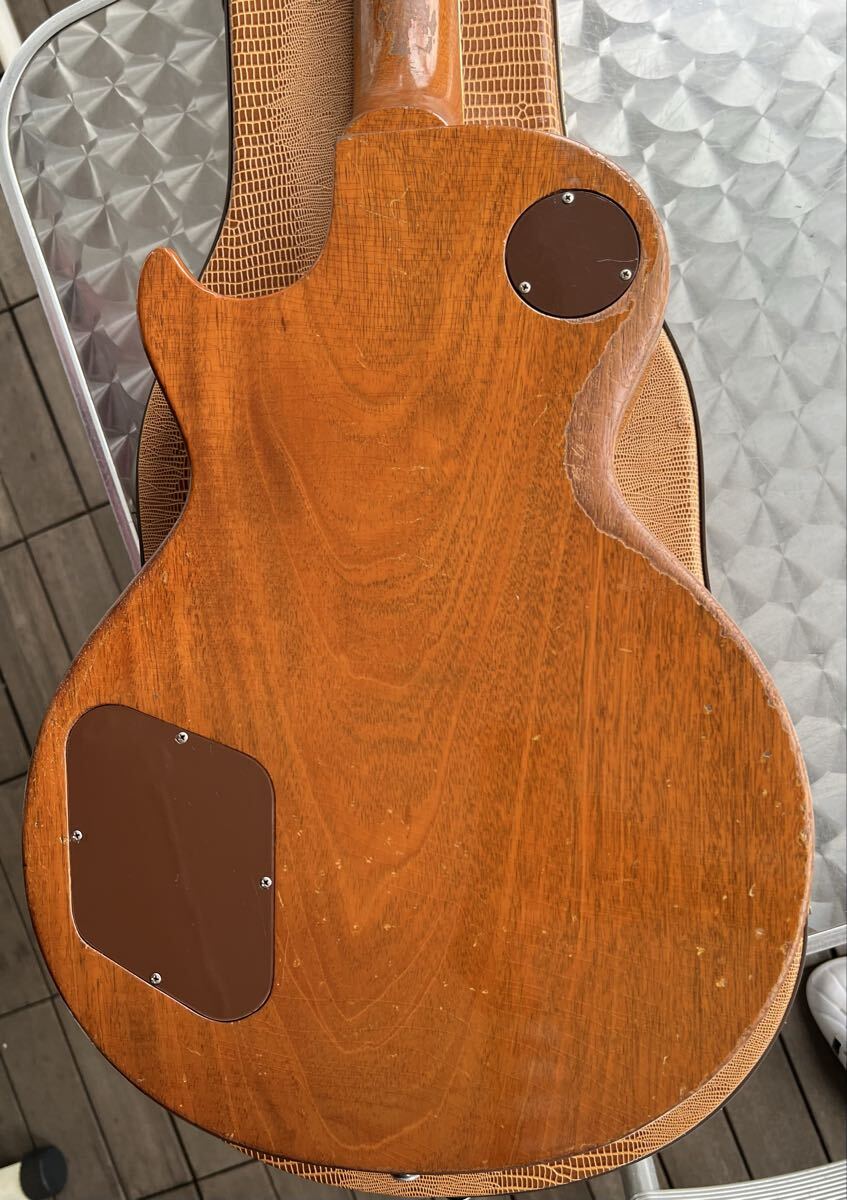 | 1955年製 Gibson Les Paul Standard をベースにPAF x 2へ ModしたGold Topになります。1957年Gold Topのブラックパーツ仕様を イメージしていますね。このギターがModに適しているのは、オリジナルが ビグスビー仕様で、ネック差し込み角度が56年以降と極似ているとのことです。 1955年オリジナル部分:木部、ペイント、Kluson Pegs, トラスロッドカバー ポット含むハーネス(キャパシターのみ1959年のバンブルビーx2) バックプレートカバーx2 スイッチティップ、ストラップピン。 '50S Gibson パーツ:PAF x 2, ピックアップリング、ABR-1 スタッズアンカー& ロングスタッズ、ノブx4。 トム・マーフィー:ピックガード、ジャック・プレート、ストップテール・ピース (DMC or Crazy Parts?かも知れないフェザーウェートのストップテールピース付属、 音は個人的にはこちらが好みでした)ハードケースはLiftonが米国向けに販売したレアー ケース、ブラウンケースより安全です。我々仲間のあいだではビキニと呼ばれていました、 ビグスビー跡が日焼けのビキニ跡を連想しますので、いずれ同色化するかは分かりませんが。 1959年Les Paul Standardが何千万円から億なのでしょうか?扱い怖くて自宅スタジオでも ヒヤヒヤですね、このModは使えます!! また、まだ諸々試せます。 その他は、自分がいつも信頼している方に、リフレット、リナット などを施して頂き、楽器として成立する施工をして頂いて居ります。 レコーディングで歴戦して来ました個体です。 ヴィンテージが高騰する中とても貴重な一台だと思います。 リタイヤに向けての楽器整理で出品致します。 ■注意事項&入札条件■ 当方ビジネス目的で出品しておりません。不要になってしまったアイテムを 出品させて頂いております。写真は拡大して確認下さいませ、その後に ご不明な点がありましたら、ご入札前に質問欄からお問い合わせ下さいませ。 出来る限りの範囲で回答させて頂きますが、出来ない場合はご了承お願い致します。 アイテムのほとんどに早期終了をしておりますが、質問欄からの 開始価格を下げるなどの価格交渉はご遠慮お願い申し上げます。 また各アイテムの問題点は解っている限り明記いたします。 例えばトラスロッドが使用出来ないネックは必ず明記します。 傷、劣化を含め個人の主観が異なると思いますので、写真にて ご確認して頂き、写真が不確実と思われる方はご入札をご遠慮下さいませ。 あくまでも素人の写真で、故意に見えにくくとか、わかりにくくする事はもうとう 御座いません。 オークションで騙されると思われる方の入札は絶対にお断り致しますので ご理解の程宜しくお願い致します。 本業がありますので、商品引き渡し後のサポート、音が出ない以外の、 返品交換、返金は出来ませんので御了承下さいませ。 お互い御礼のメッセージを出来る様な、気持ちの良いオークションにしたいと、 心の底から望んでやって居りますので、ご理解宜しくお願い申し上げます。 ※お支払い方法について※ お支払いはYahooかんたん決済のみになります。 ※発送方法 手渡し希望ですが、ご要望が有れば発送致します。 以上が入札の条件ですのでくれぐれも宜しくお願い致します。 落札後24時間以内にご連絡を頂けますと、皆様の落札アイテムを 同時に早急にお送りする事の可能性が高くなりますのでご理解の もとご協力お願い申し上げます。入金後の当日翌日の発送に努めていますが、 落札者様からの連絡、入金が遅れる場合全体的な発送が遅れてしまう事が ありますのでご承知お願い申し上げます。 それでは、お探しのアイテムが見つかる様祈っております。 |