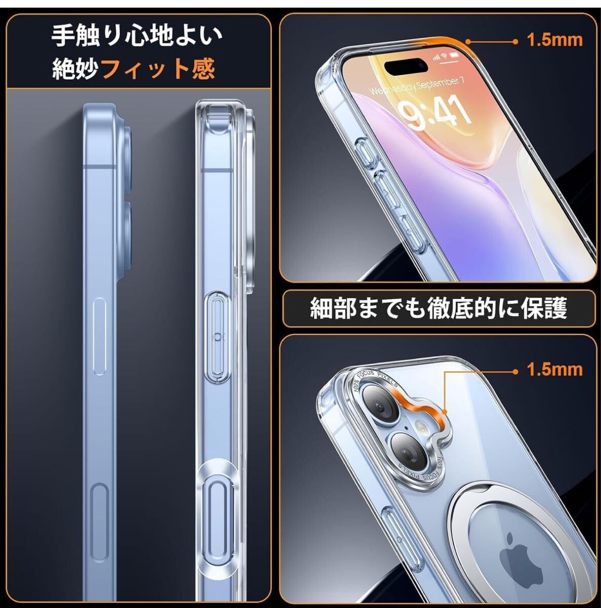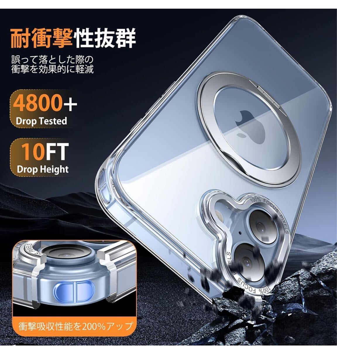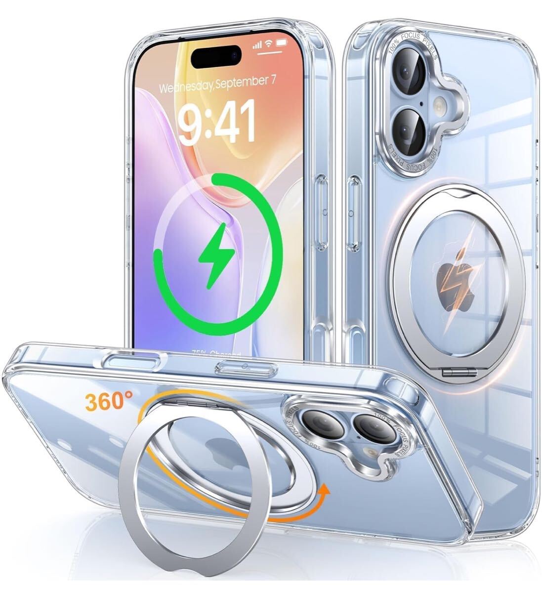 iPhone 17 用 ケース Magsafe対応 ワイヤレス充電 360°回転スタンド 縦横両対応 Gunwon スマホケース あいふおん 17 用 耐衝撃 マグセーフ 防指紋 リング マグネット搭載 アイフォン17 用 カバー「クリア」