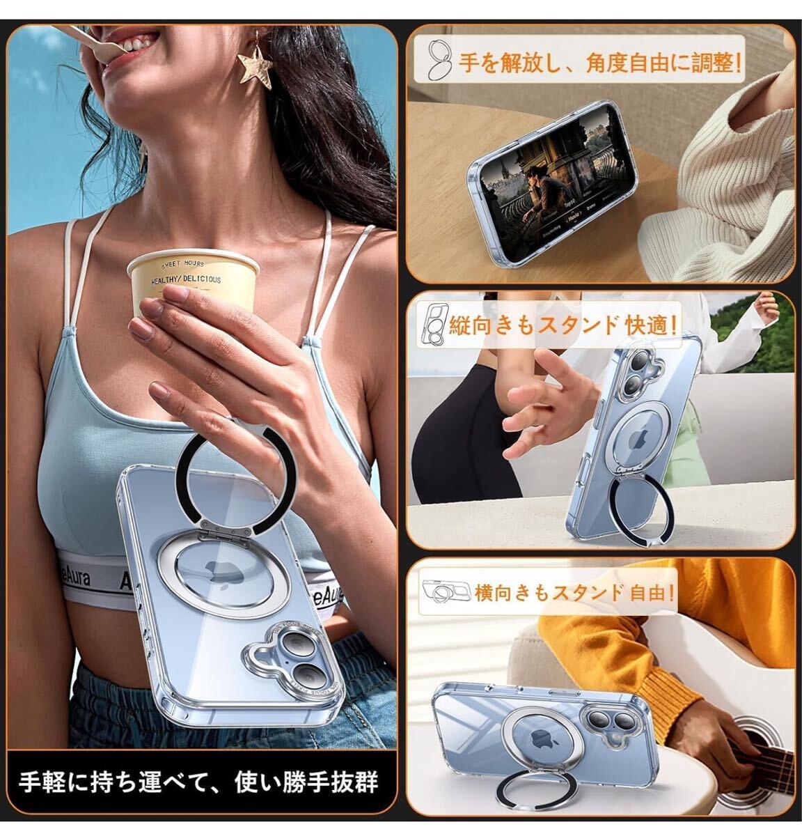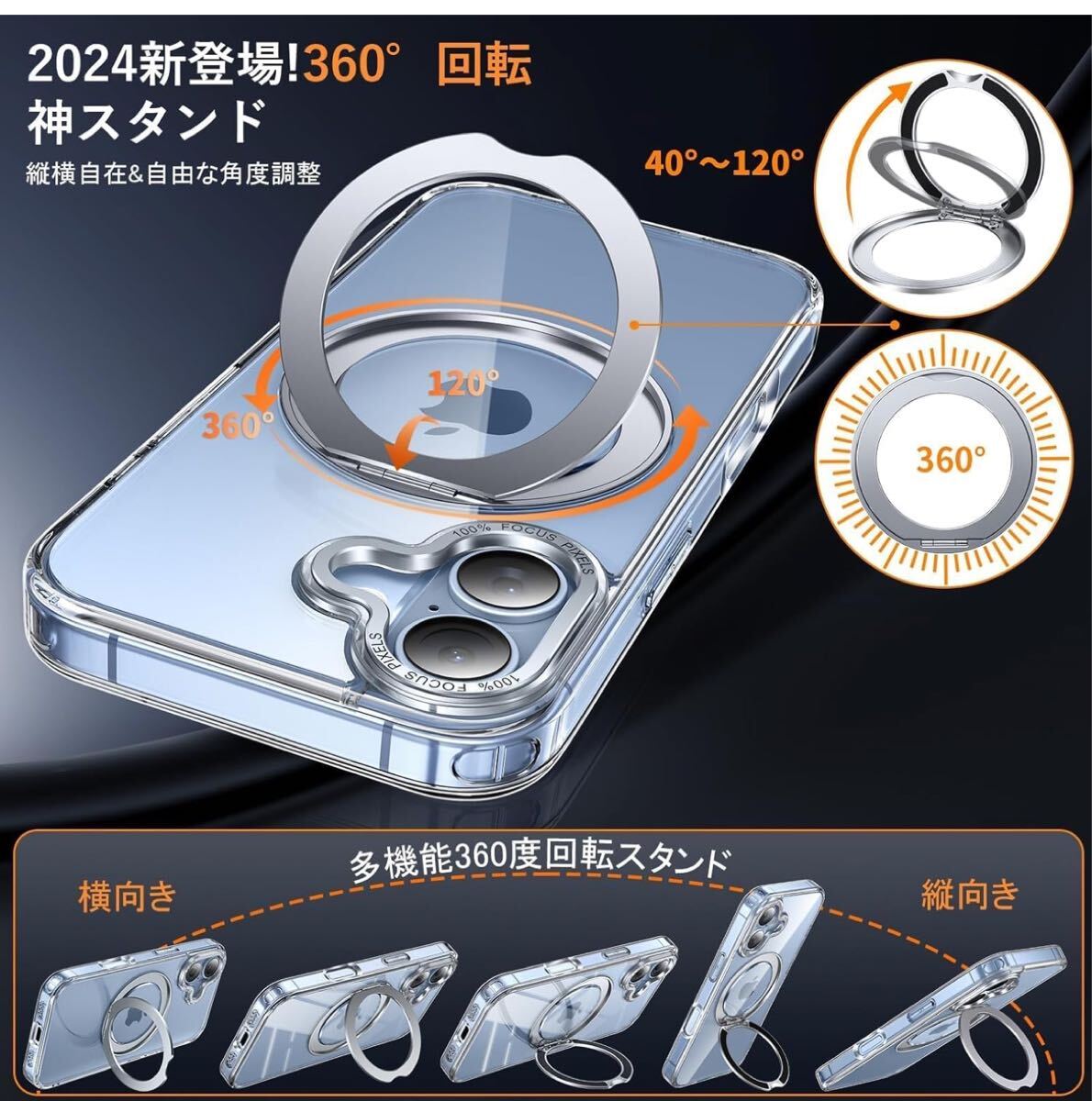 多機能360度!縦も横も思いのまま!】:背面に搭載された嵌め込み式リングは、安定したアルミ合金製の円形スタンドを採用しており、従来のリングと比較して滑りにくく、安定したグリップを提供します。360°回転スタンド機能により、縦置き・横置きどちらの状態でも安定して利用でき、0°~ 120°の間で多角度自由に調整できます。動画視聴やFaceTimeを利用する際には、両手を解放し。外出先でも手軽に使用でき、リングやスタンドを持ち歩く必要がない。ケースを開けるだけでスタンドの完成!指にかければリングも便利に使用でき!ケースを閉じれば背面はスマートに平坦に。無限の使い方が可能で、機能性を重視する方にはぜひ手に取ってみてください!【iPhone 17 用 ケース あいふぉん 17 用 ケース アイホン 17 用ケース】