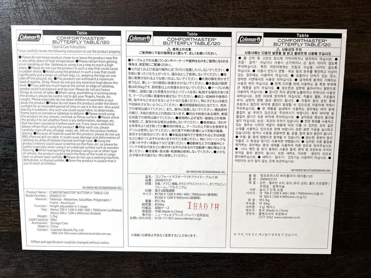 コールマン、マスターシリーズのテーブル、幅120㎝奥行き70㎝です。高さは44㎝、60㎝、70㎝の3段階可能です。