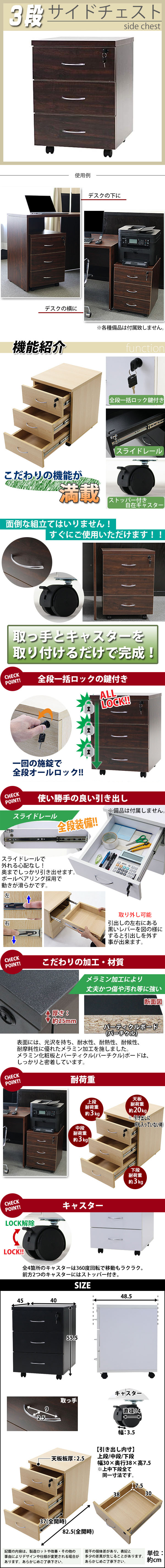 | 商品名 | 送料無料 3段 サイドチェスト 半完成品 約W40×D48.5×H55.5 鍵付き キャスター付き オールロック サイドキャビネット サイドワゴン デスクワゴン デスクチェスト 3段ワゴン オフィスワゴン デスクキャビネット 会社 事務所 脇机 ウォールナット sidechestcd08 |