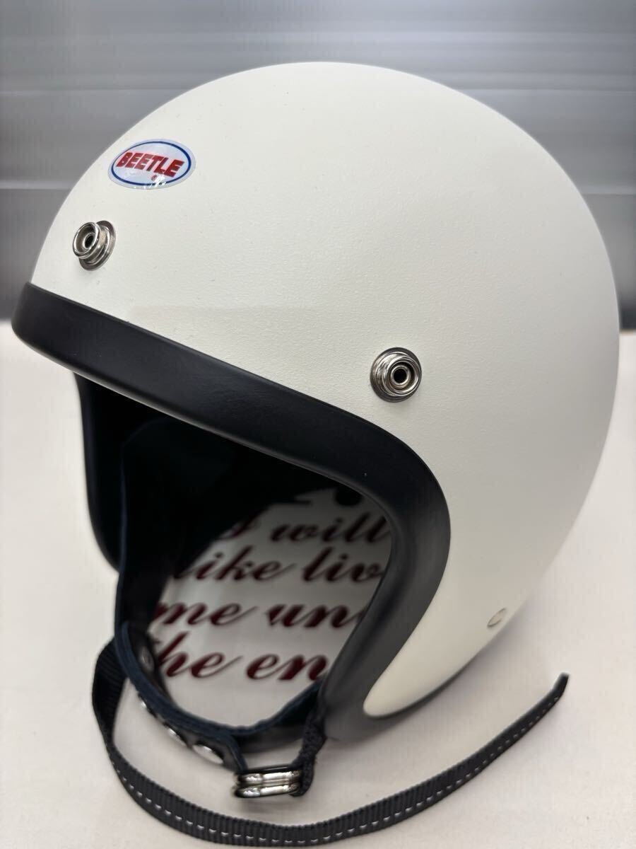 オールドヘルメットはダブルストラップの仕様が多く使われていて、金具、レザー部分がよりカッコ良さを引き立てます。