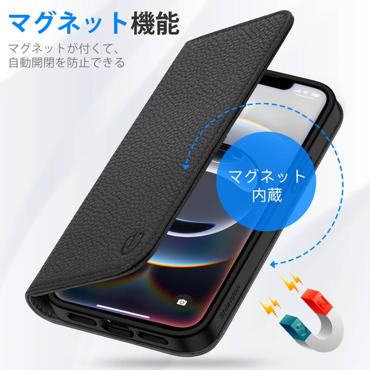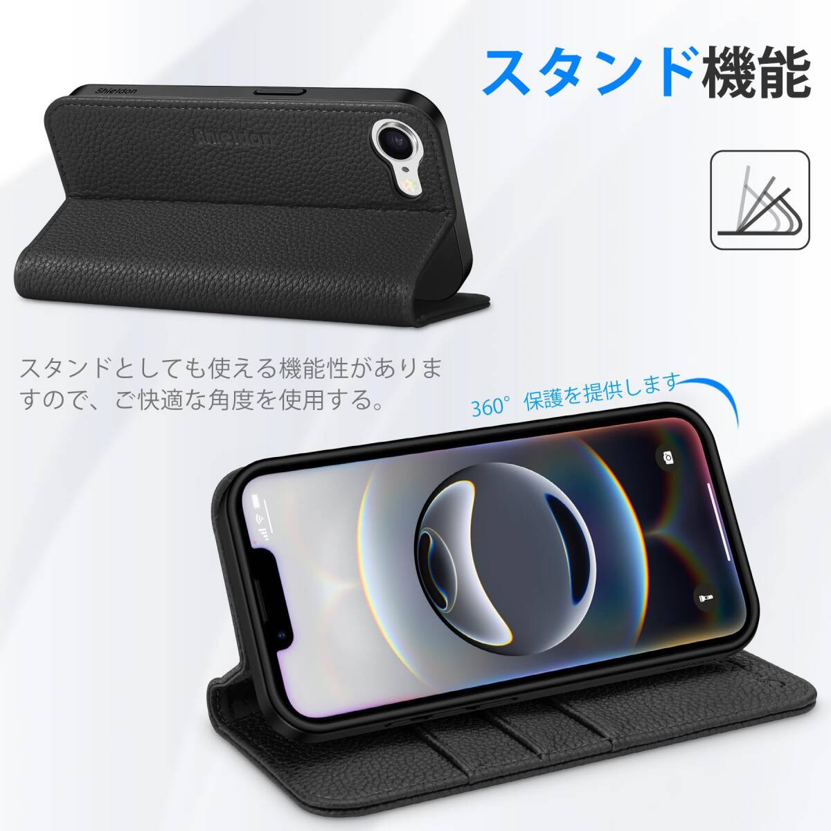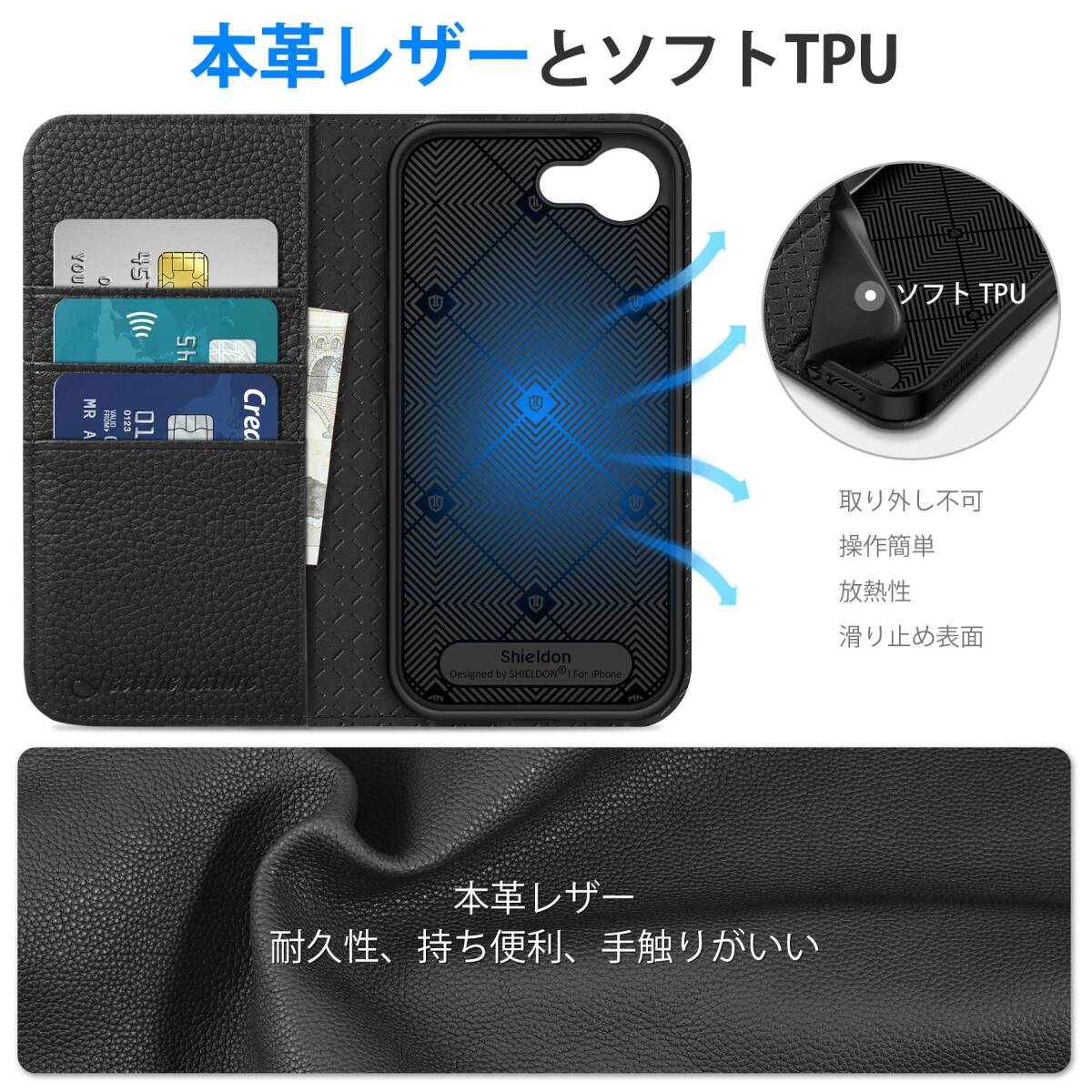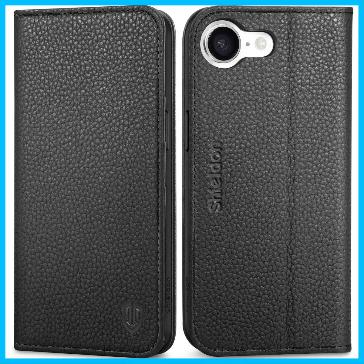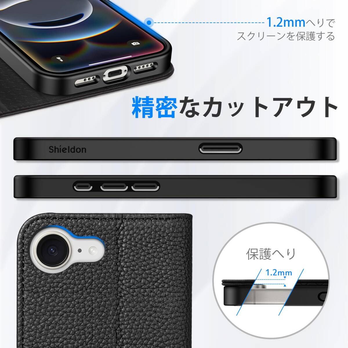 SHIELDON iPhone 16e対応ケース 本革 手帳型 アイホン16e用 スマホカバー 衝撃吸収 TPU素材 カード収納 横置きスタンド機能 マグネット内蔵 [RFIDブロッキング] 全面保護 あいふぉん16e 対応スマホケース 2025年発売 6.1インチ 5G ライチブラック