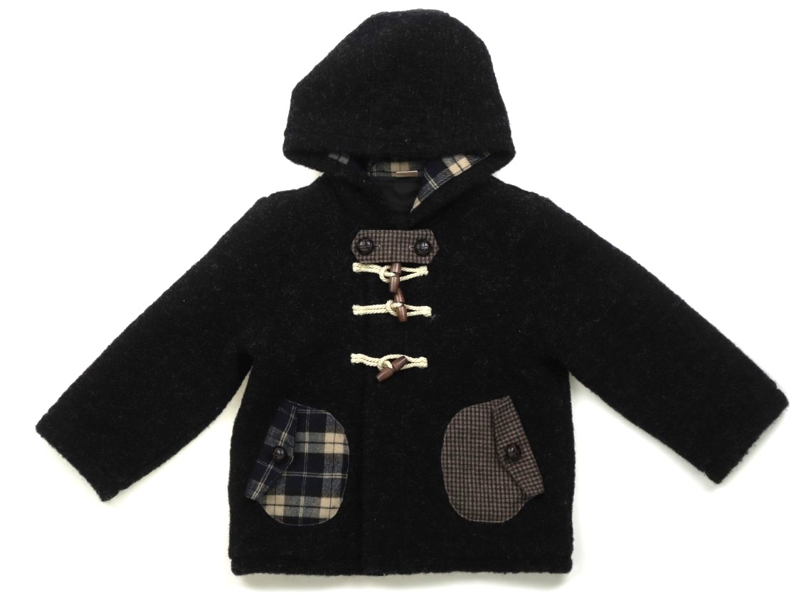 ウール・ポリエステル素材。裏地付き。ファスナー・トグル開き。フードは縫い付けです。フードをまとめるタブ付き。目立った汚れのない良品です。
