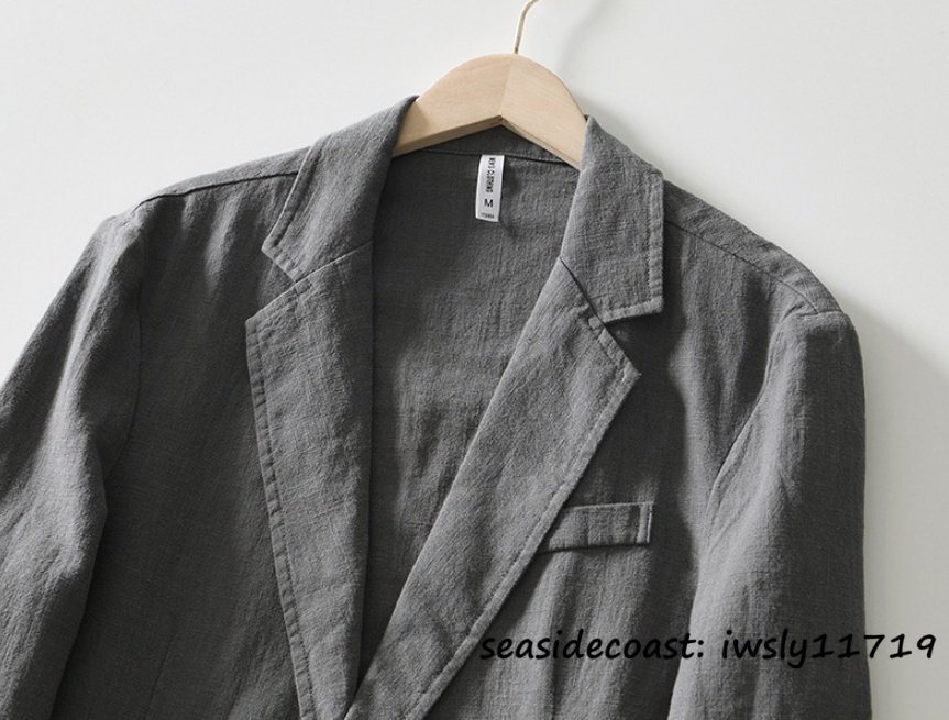 超希少*テーラードジャケット メンズ 春夏秋 リネンジャケット 麻100% 無地 清涼感 通気性 ブレザー 麻スーツ 紳士服 鮮やか グレー L