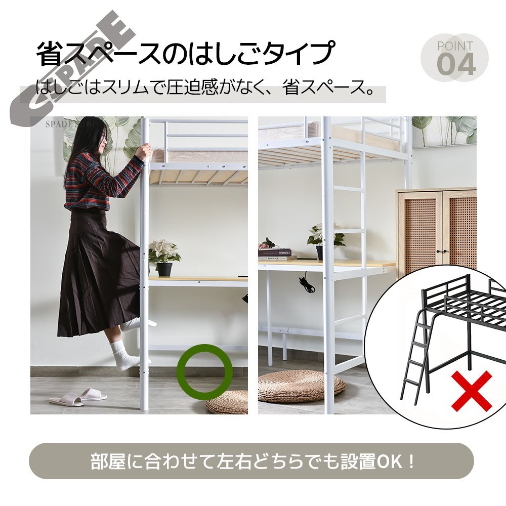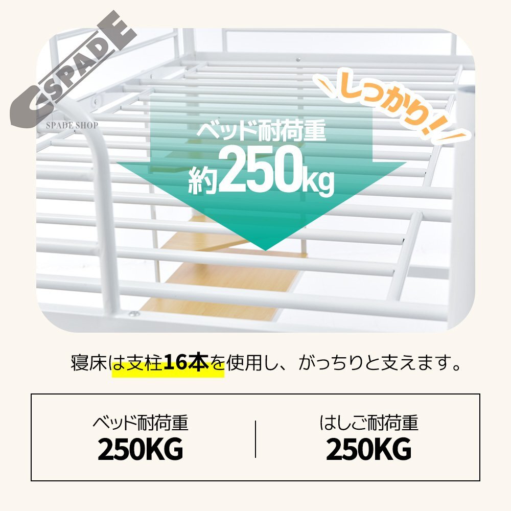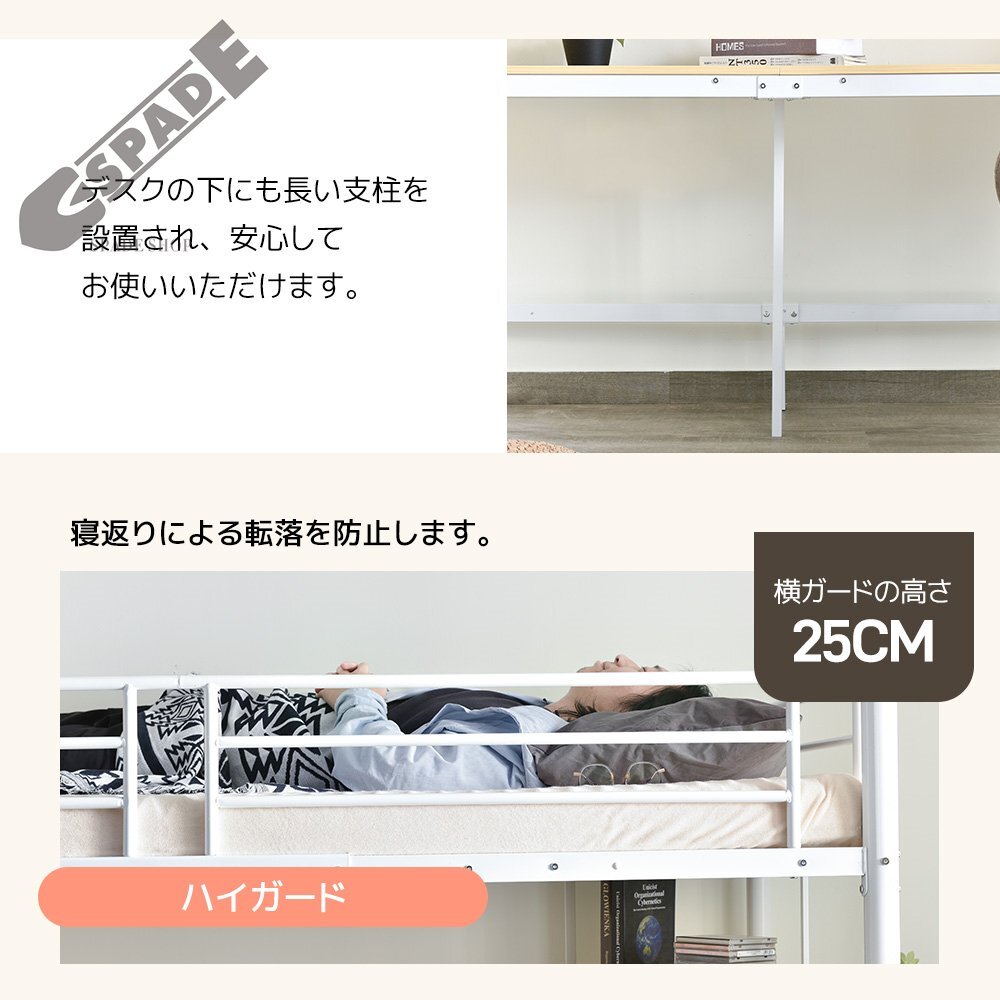 • 【 安心して使える頑丈設計】安全面を追求したこだわりの設計で、横揺れ・キシミを抑えて誰でも安心に使えます。 ちょうどうの太さで握りやすく、ベッド全体を安全に支えてくれます。 寝床は支柱16本を使用し、がっちりと支えます。 デスクの下にも長い支柱を設置され、安心してお使いいただけます。