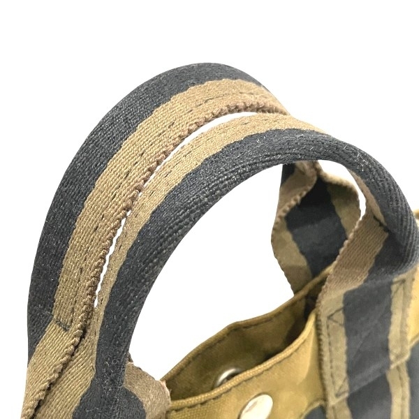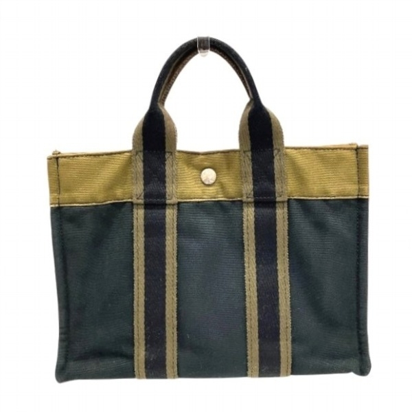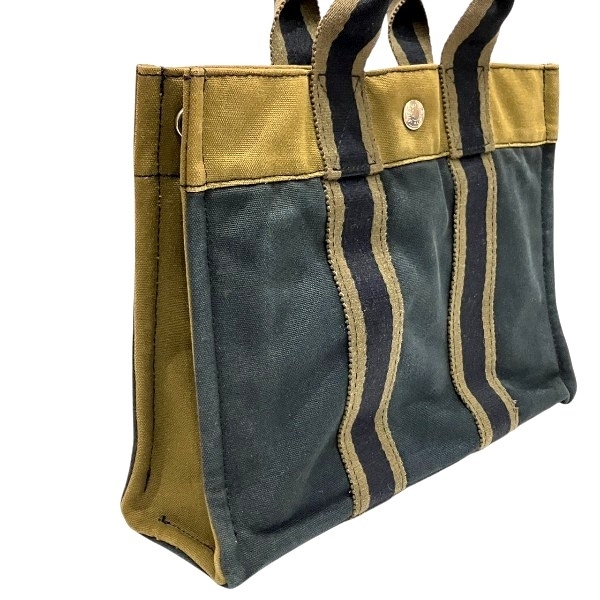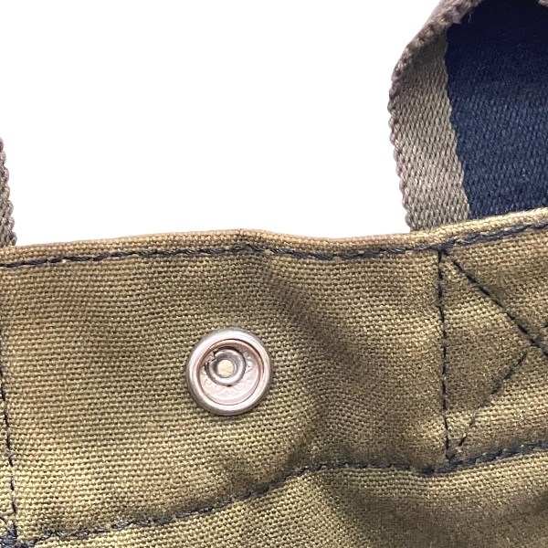 | 【ブランド】エルメス 【商品名】フールトゥPM 【カラー】ネイビー×カーキ 【素材】キャンバス 【仕様】外側:ポケットなし 内側:ファスナー付ポケット×1 【サイズ】H約23cm×W約30cm×D約8cm 持ち手:約26cm 【付属品】なし 【ランク】B (使用感あり) 【状態】 持ち手:擦れ、汚れ、中程度有り 外側の状態:擦れ、角擦れ、汚れ、色褪せ、変色、中程度有り 内側の状態:汚れ、染み、小程度有り 金具の状態:擦れ、傷、変色、中程度有り その他コメント:センターホック閉まりますが、固めです。 | |