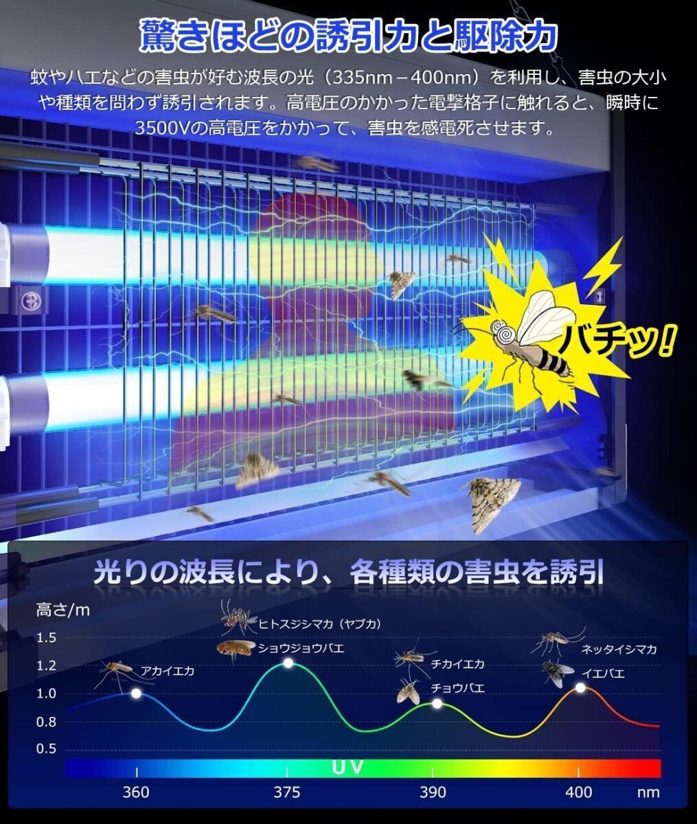 進化した殺虫器のuvライトの波長365nm(蚊を誘い込む波長)から360‐400nmまで広くなり、誘引できる虫の種類はより多い。