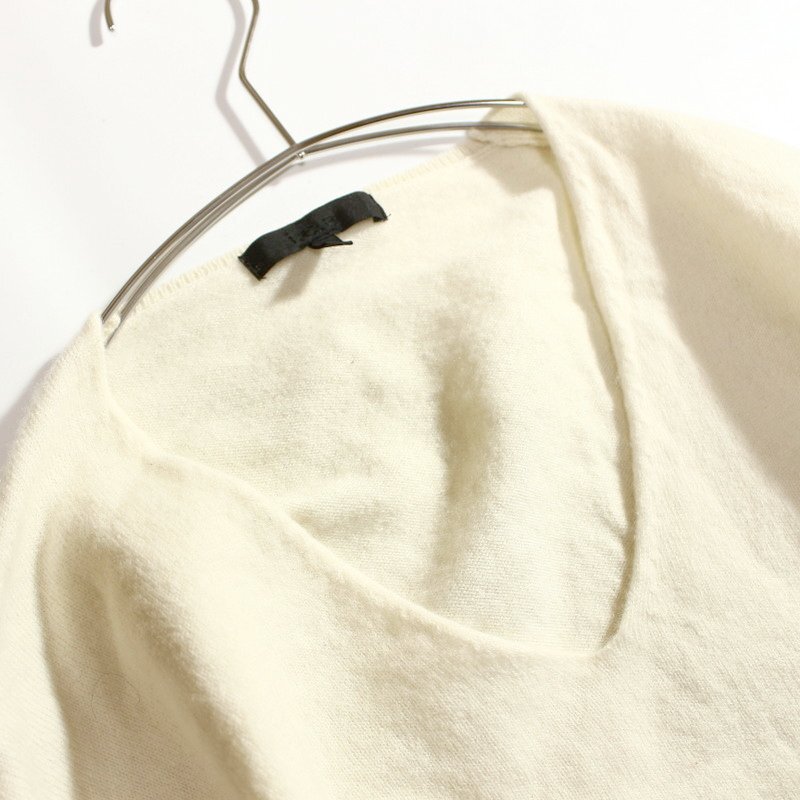 ホワイトカラーカシミヤニット、シンプル、左手お袖に筆記英字でi can be anythingと刺繍が入っています。