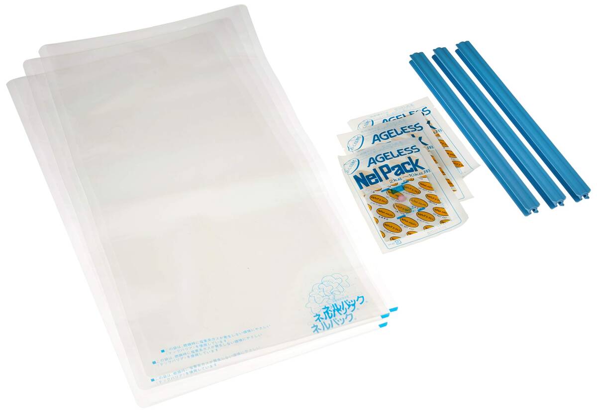 ・セット内容:(ハイバリア袋(複合ラミネート袋)・ネルパック専用エージレス(脱酸素剤)・エージレスアイ(酸素検知センサー)・ガッツ棒(クリップ凸凹1組))×3セット