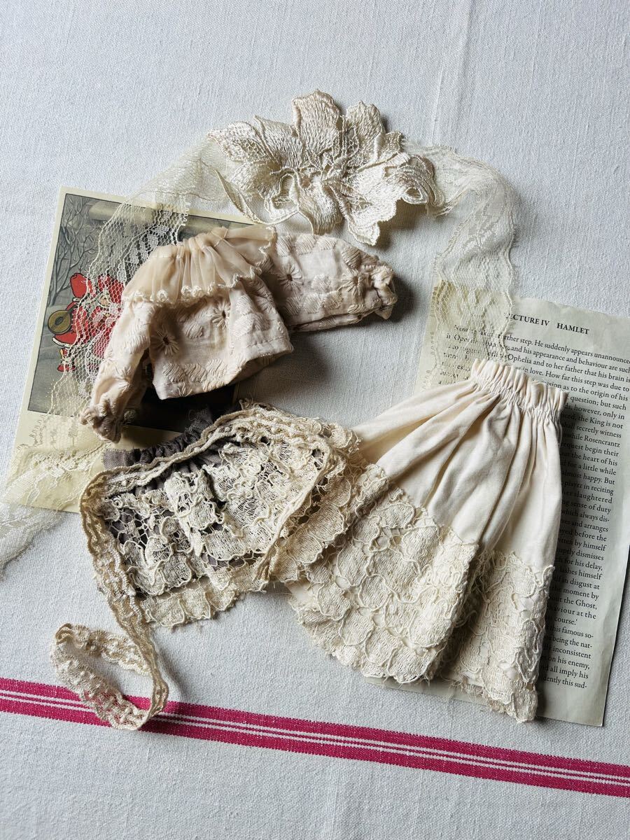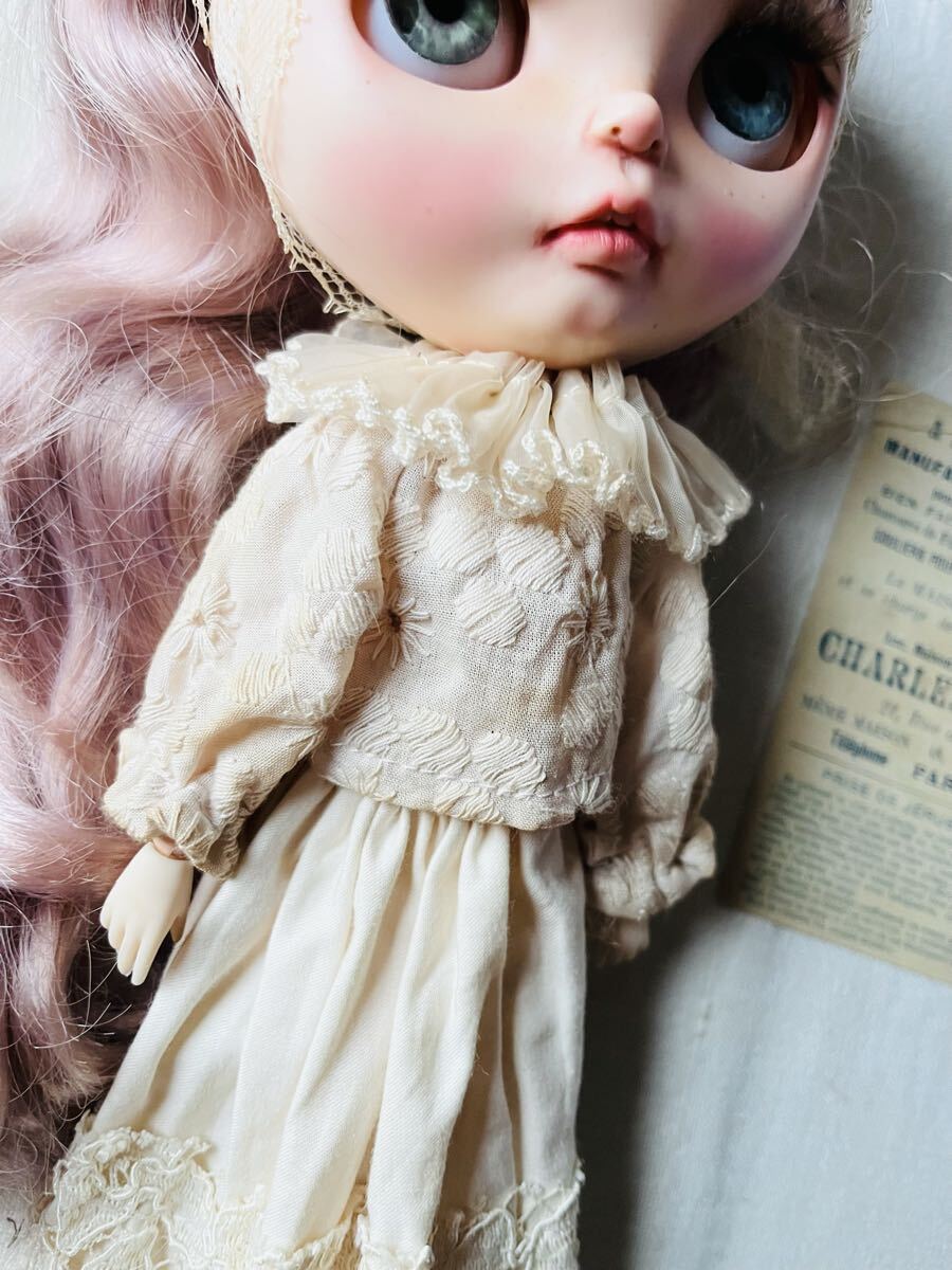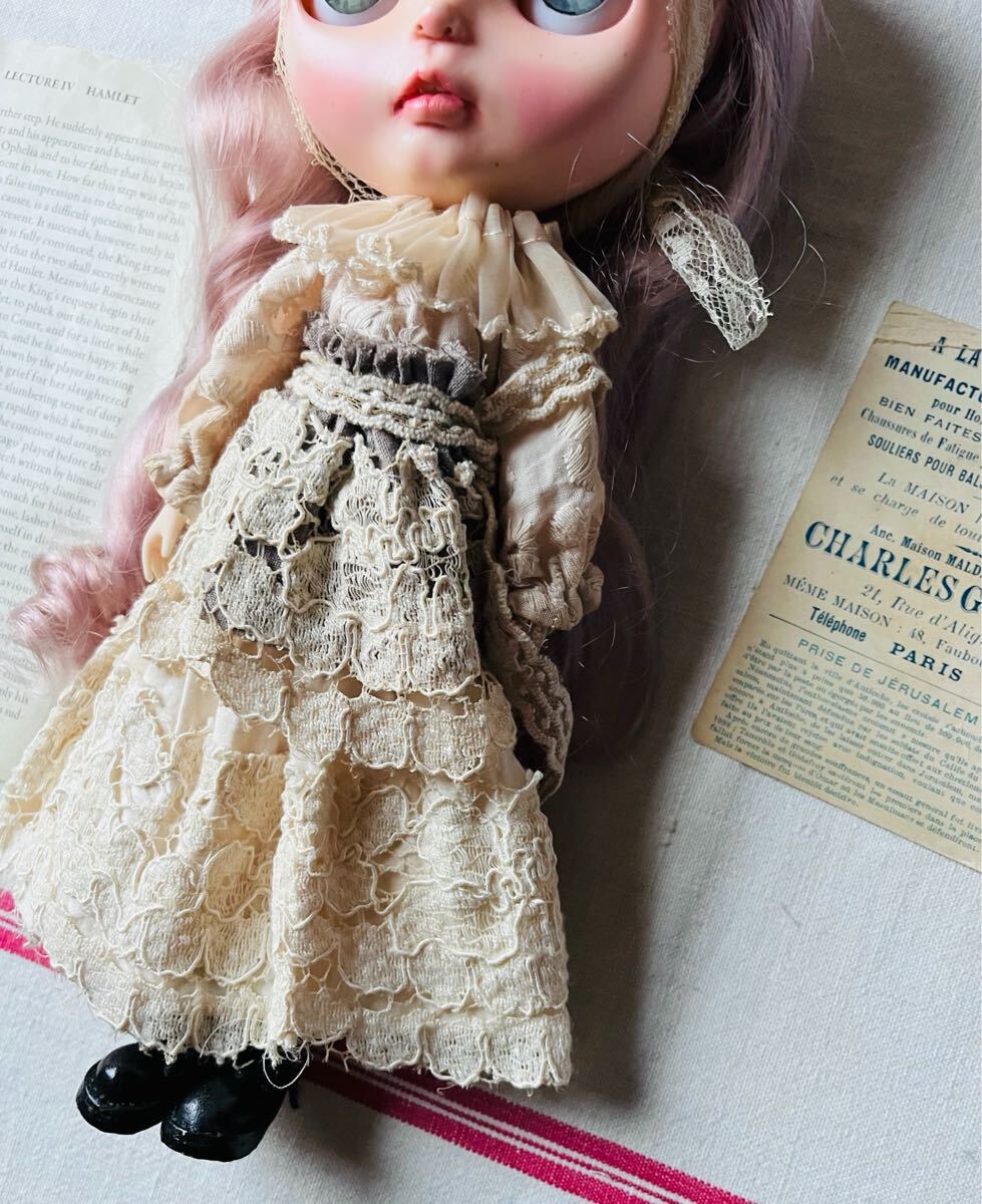 こちらのお洋服は紅茶染めをしてアンティークの風合いを出しています。