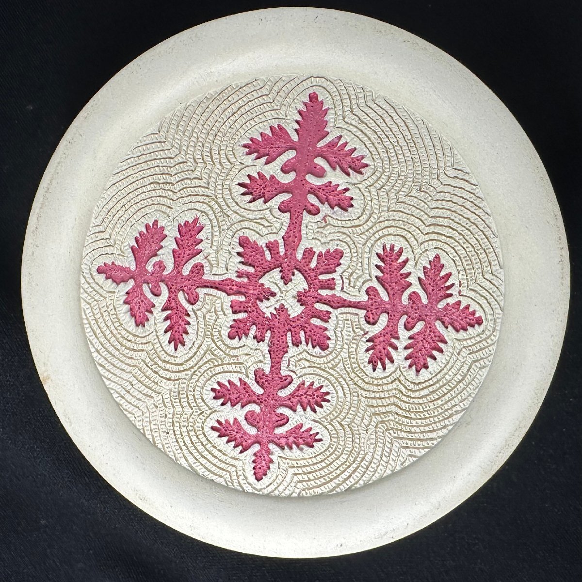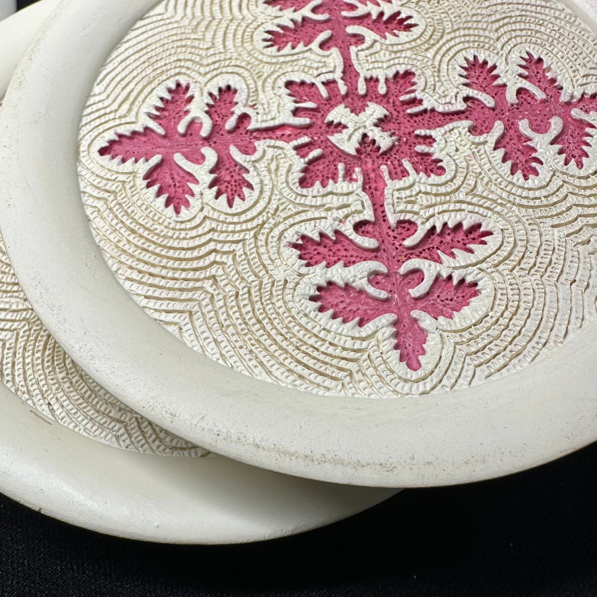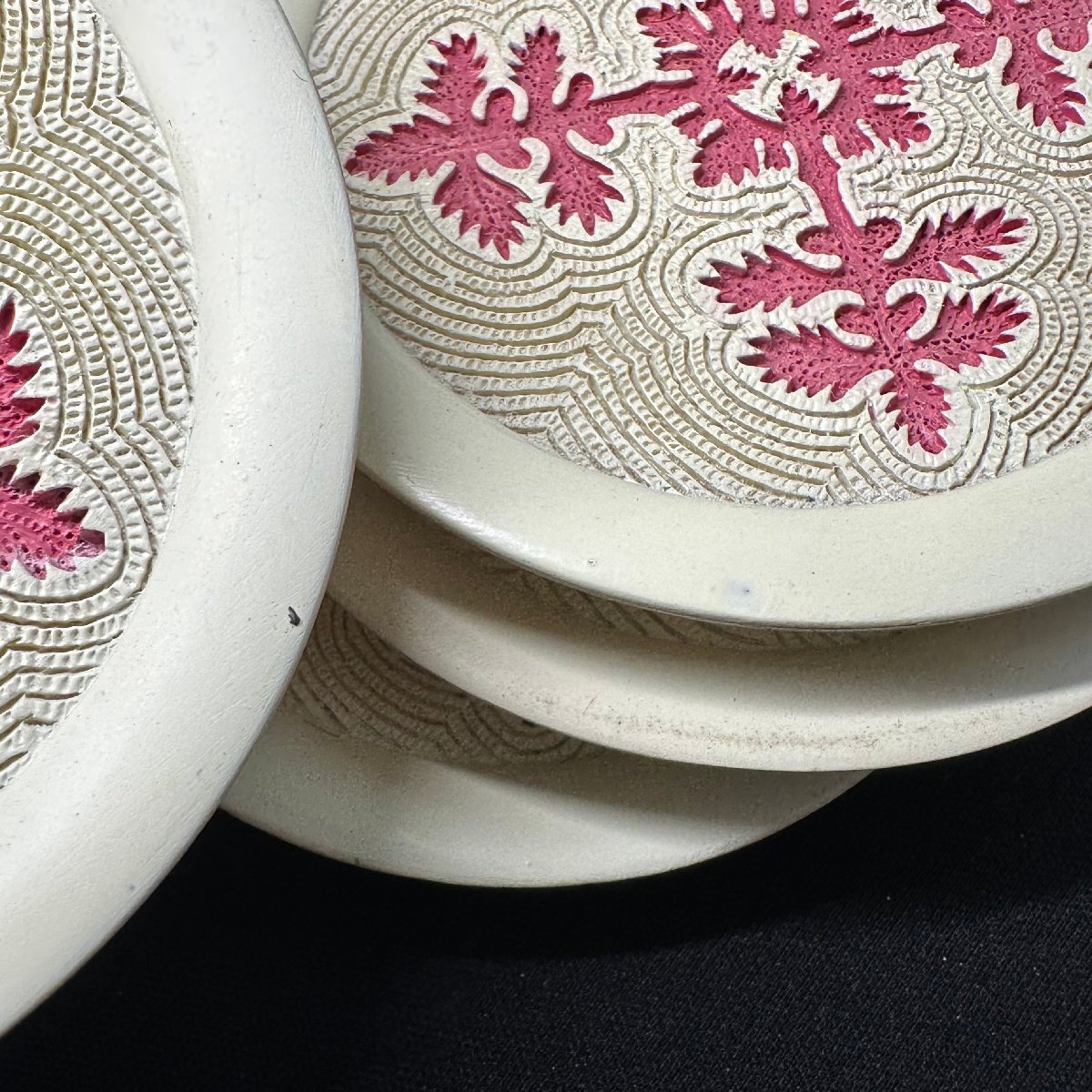 白地に浮かび上がる紅色の植物文様(桜や雪花を思わせるデザイン)が、テーブルに華やぎを添えます。
