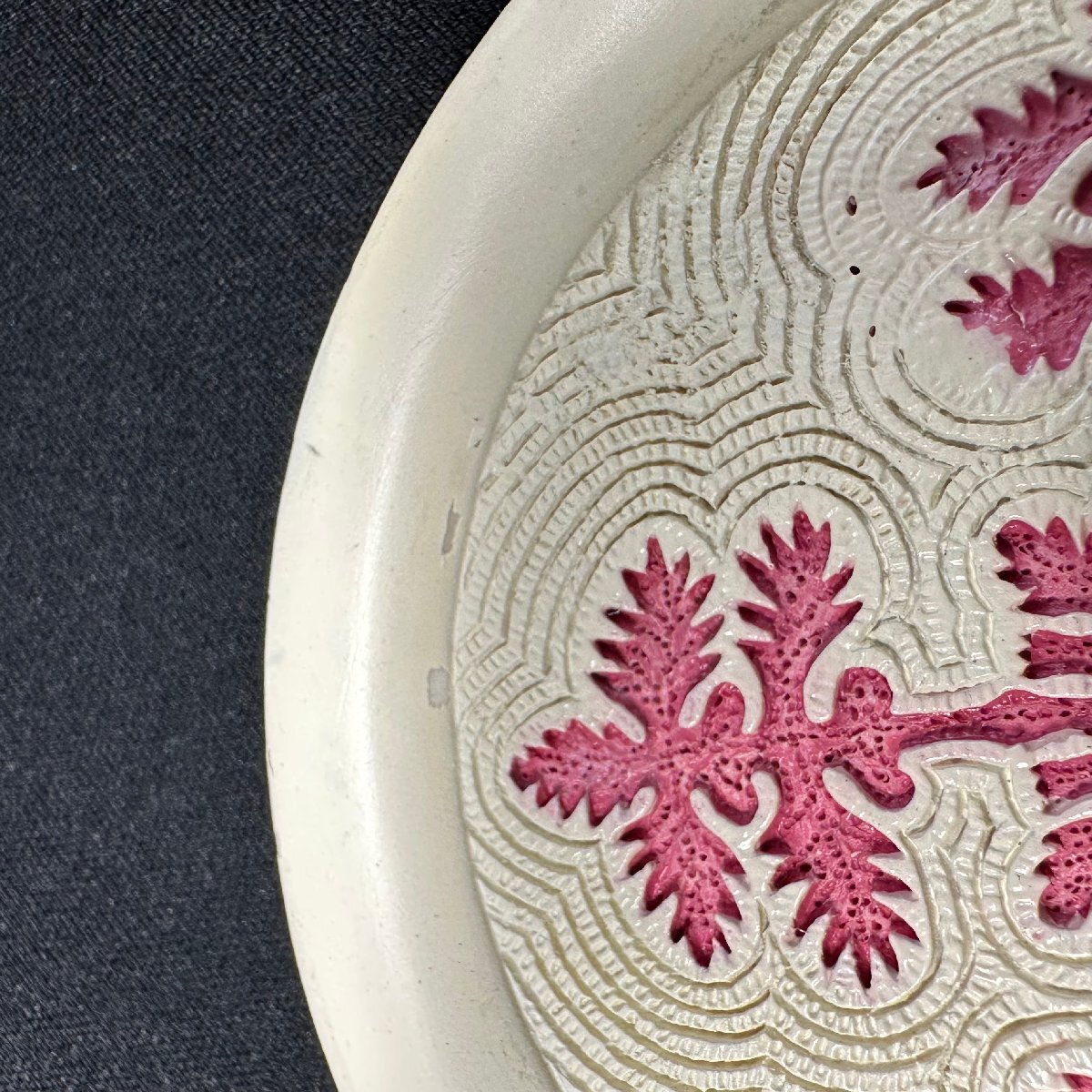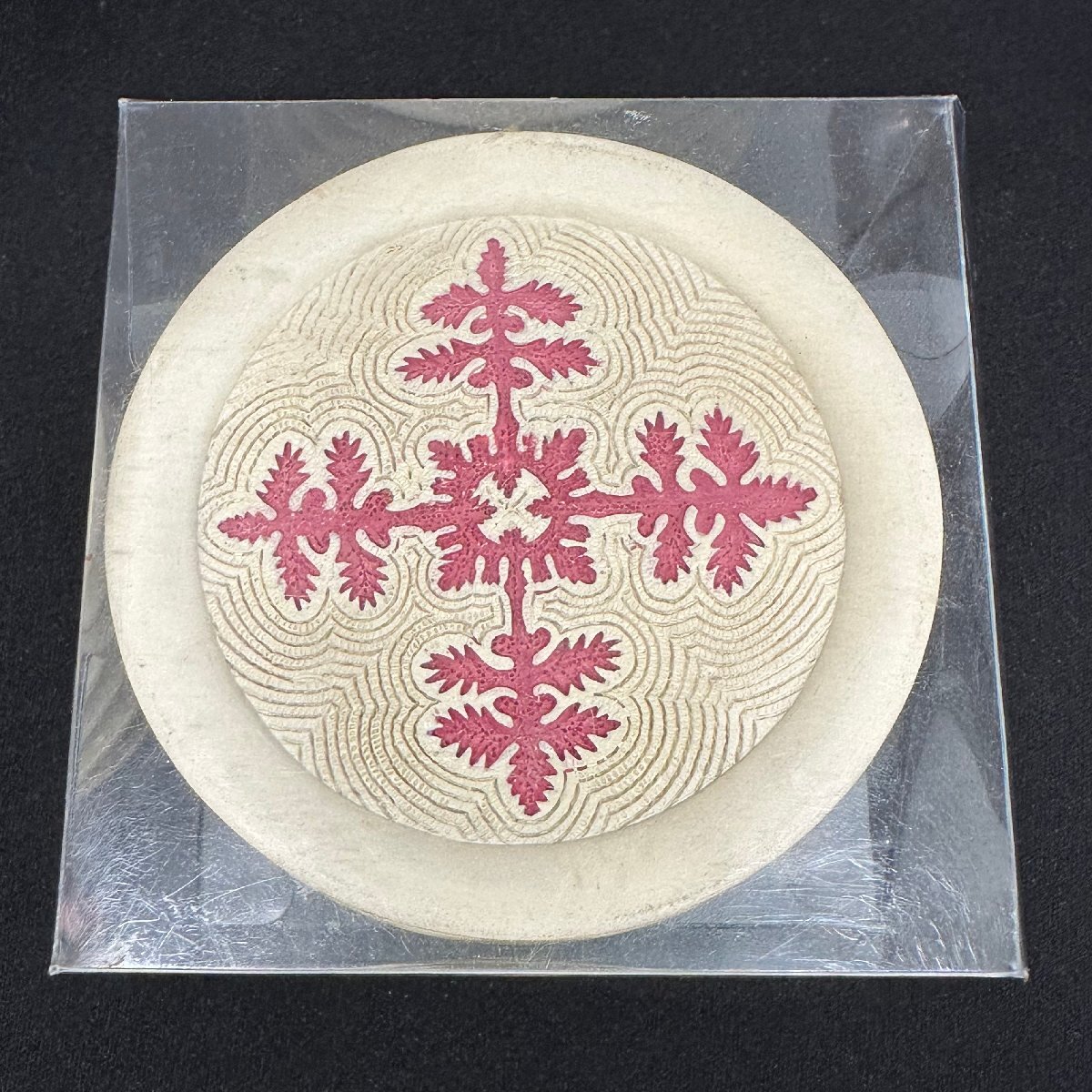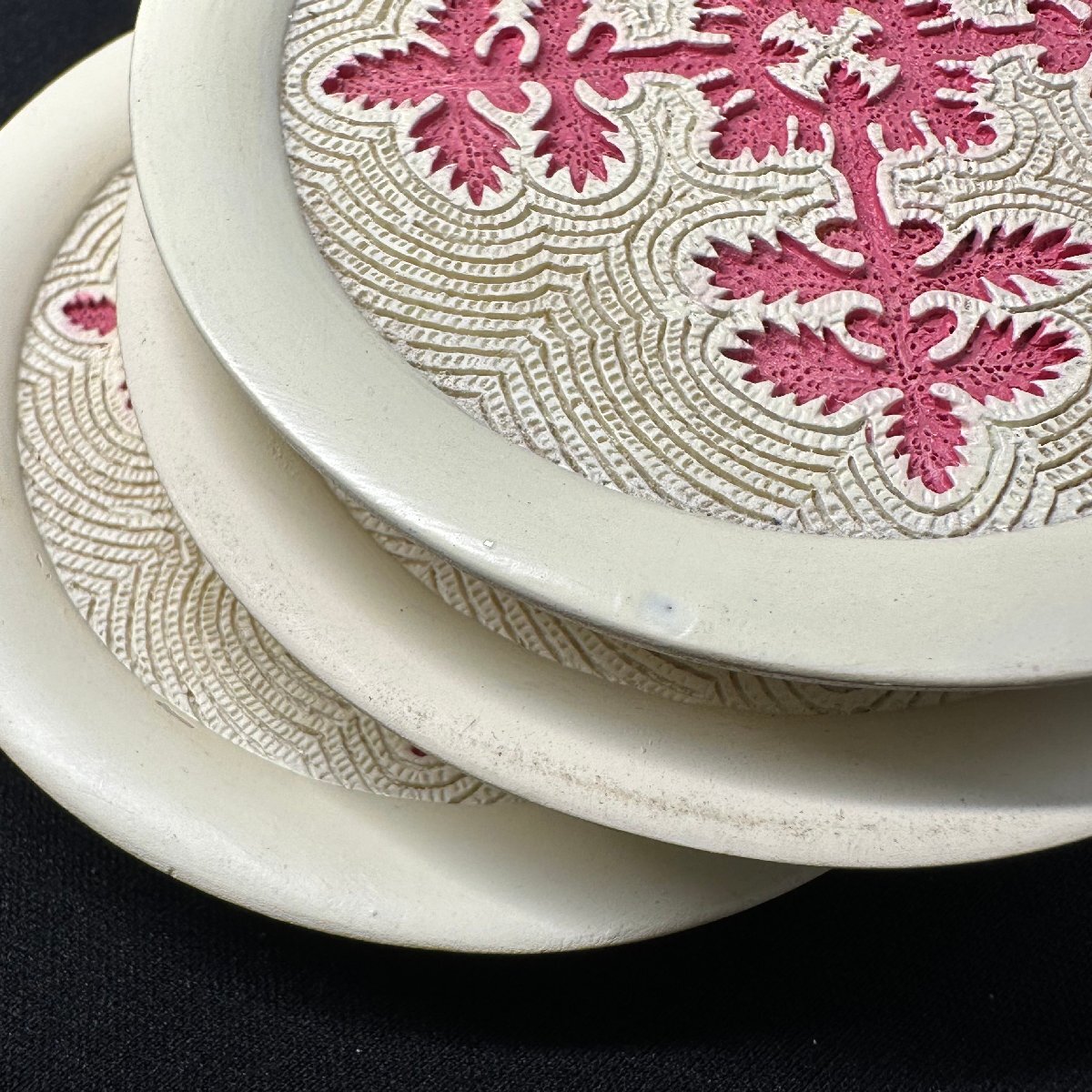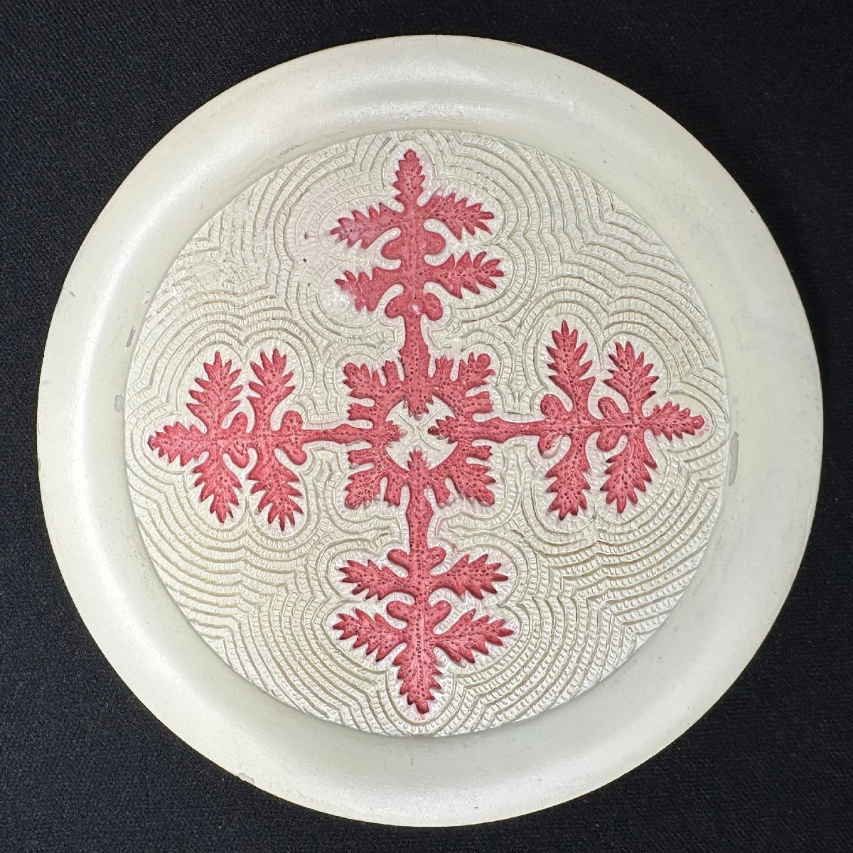 白地に浮かび上がる紅色の植物文様(桜や雪花を思わせるデザイン)が、テーブルに華やぎを添えます。