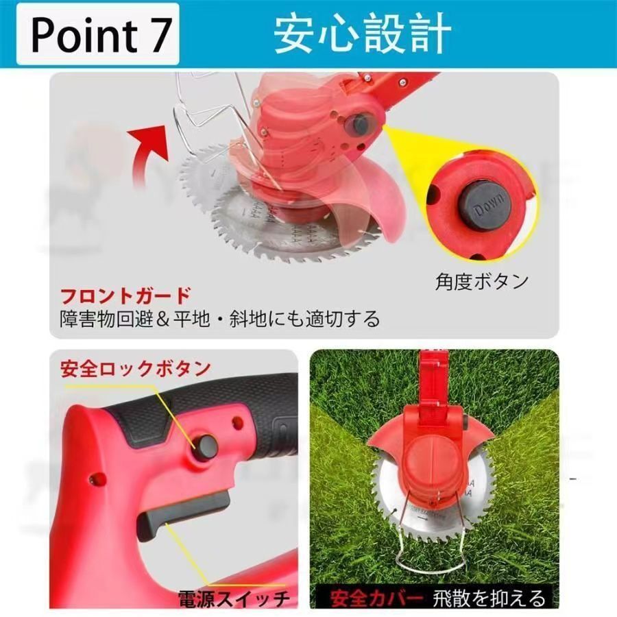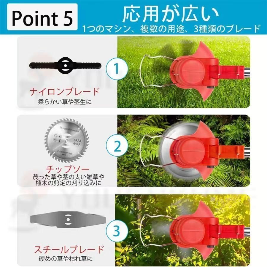 【3 in 1草刈機3種類のブレード】3種類の異なるタイプのブレードを備えた電動コードレス除草器。1機多用:プラスチック刃は柔らかく柔らかい芝生の草刈りに適している、ステンレス鋼の金属刃は雑草、小低木の剪定に適している、40歯合金鋸刃は、厚い低木、木の枝、苗木を切断するのに適しています。(刃が壊れないように、除草時に正しい刃を選んでください。)