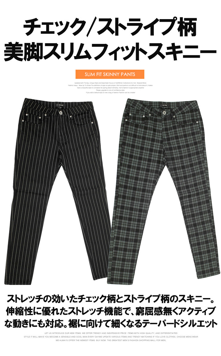 | 商品説明 | ストレッチの効いたチェック柄とストライプ柄のスキニーパンツです。 |