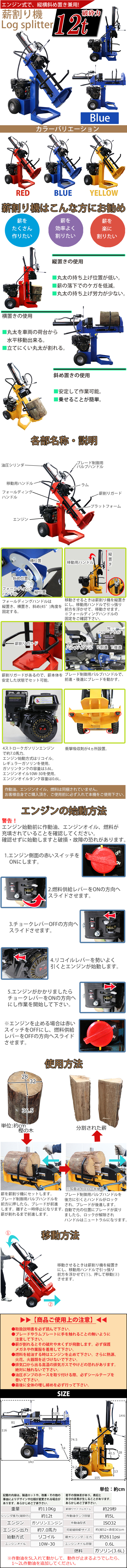 | 商品名 | 送料無料 薪割り機 薪割機 ログスプリッター エンジン式 破砕力 12t 約7.0馬力 横割り 縦割り 斜め割り カッター まきわり マキワリ 薪ストーブ 斧 薪 破砕 油圧 オイル 木 木材 原木 丸太 家庭用 ブルー logs12u7hpbl |