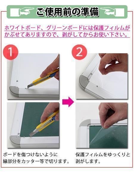 | 商品紹介 | □◆ホワイトボード×グリーンボード◆□ ●大切なメモや伝言をサッと書き残す事が出来る回転式ホワイトボード×グリーンボードです。 ●簡単に消す事も出来、ホワイトボードとグリーンボードの使い分けも出来るので大変便利。 ●マーカーとイレーザー付きなので、組み立てればすぐにホワイトボード側をご使用いただけます。 ※チョークや黒板消し等グリーンボード側の筆記具は付属いたしません。 ●マグネット付きなのでメモ書きを残す事も可能。 ●フルトレイなので、マーカー等の収納にも困りません。 ●会議や塾等様々な用途に合わせてご使用頂けます。 ※こちらの商品は、組立て式です。 組立てについて…組立てには、17番のスパナ2本が必要になります。(ペンチ2本でも代用可能です。)お客様自身でご用意お願いします。ナットには、ゆるみ防止の樹脂を塗っているので、それを突き破って締め込んで下さい。 ※保護フィルムを剥がしてからお使い下さい。 ※ホワイトボードには、ホワイトボード用のマーカーをご使用下さい。 ※グリーンボードには、チョークをご使用下さい。 ●本体重量:約16kg ●材質:アルミ(ボード枠)、スチール(フレーム)、プラスチック(キャスター、マグネット、マーカー、イレーザー) ●付属品:マグネット(赤3個、青3個)、中字丸芯油性マーカー(黒1本、赤1本)(筆記線幅:約2mm)、イレーザー(1個) ●新品商品ではありますが、輸入商品の為、多少の擦り傷などがある場合がございますので、ご納得の上ご購入下さいませ。 ●ご購入後、お客様ご都合によるご返品、ご返金等は一切お受け致しておりません。 ●本商品を使用した際に発生したトラブル、事故につきまして、当社は一切の責任を負いません。ご使用に関しましては、全て自己責任にてお願い致します。 |
