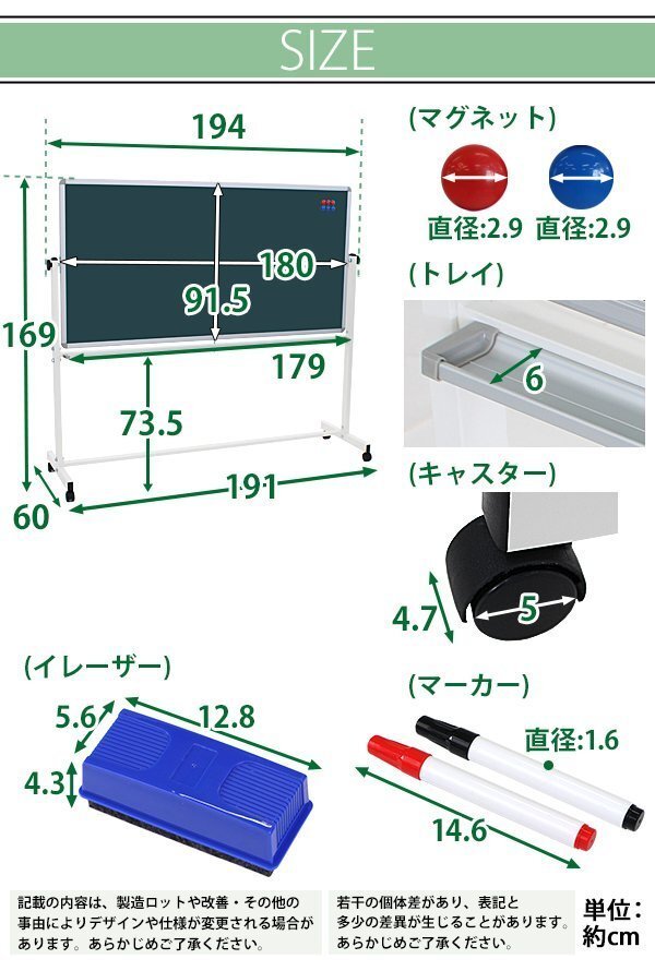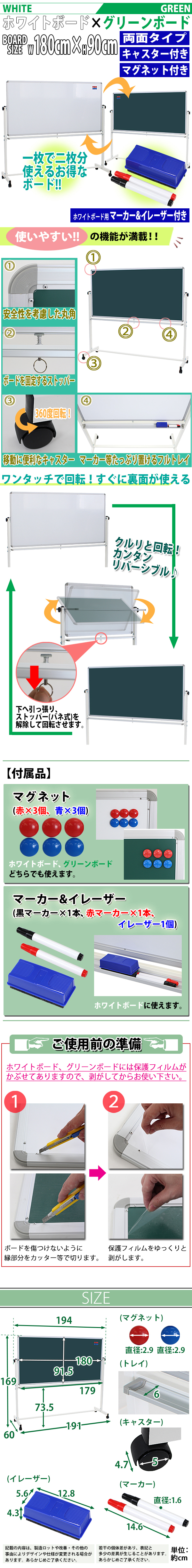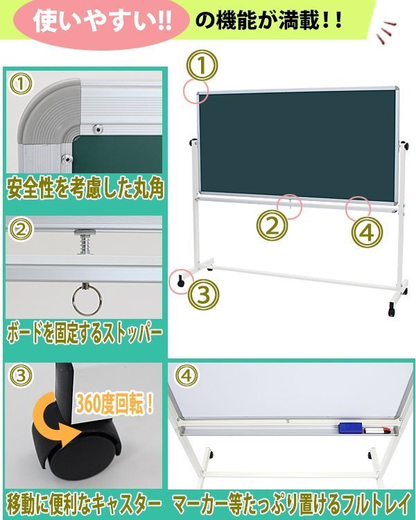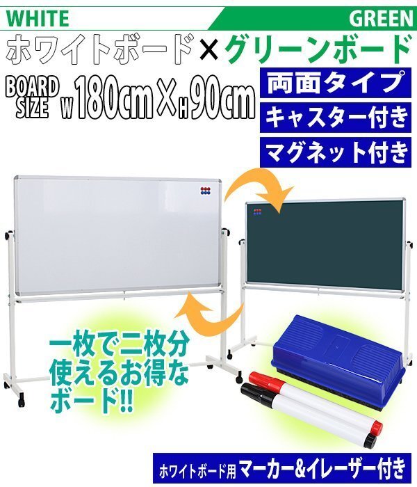 | 商品名 | 送料無料 新品 ホワイトボード グリーンボード W1800xH900 両面 マーカー イレーザー マグネット付 チョークボード 回転式 がっちりフレーム 1800x900 180x90 トレイ付き スタンド キャスター付き 脚付き アルミ枠 回転 白板 黒板 スチール 掲示板 ブラックボード 18090wg |