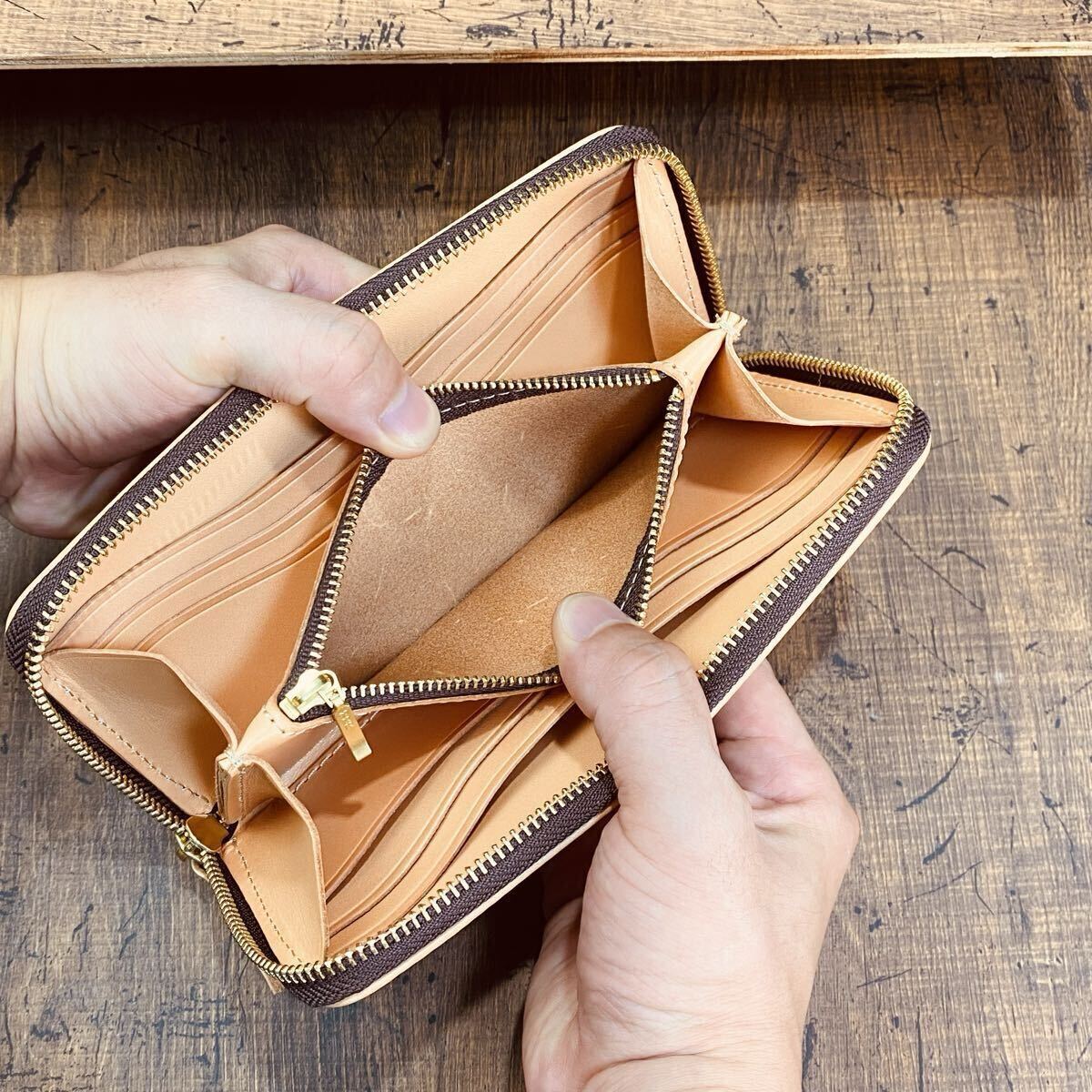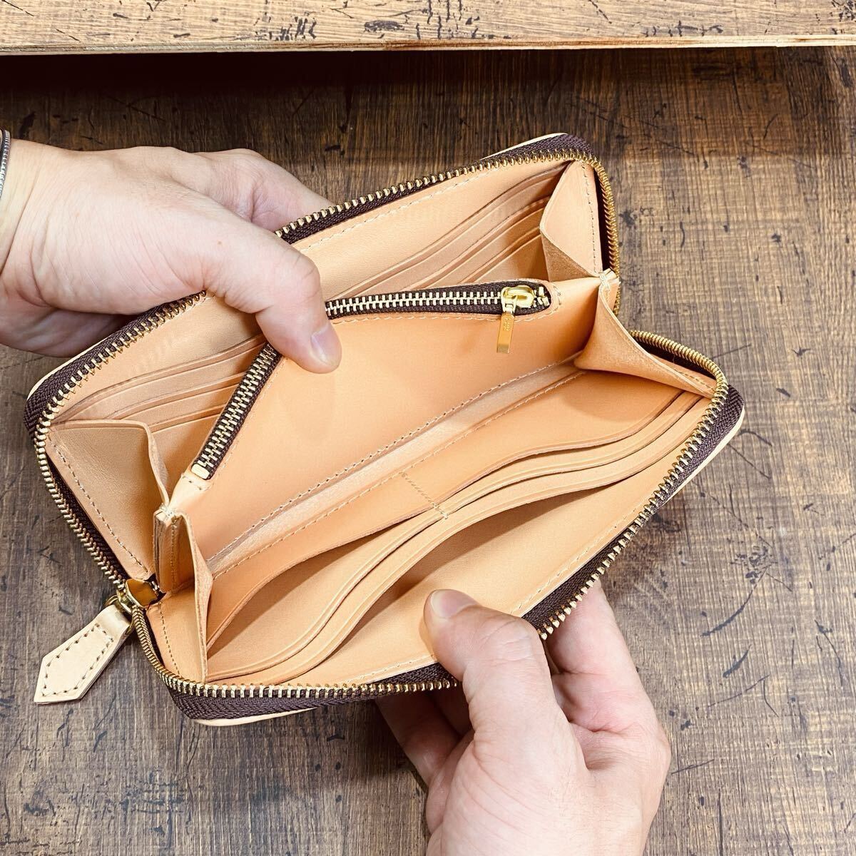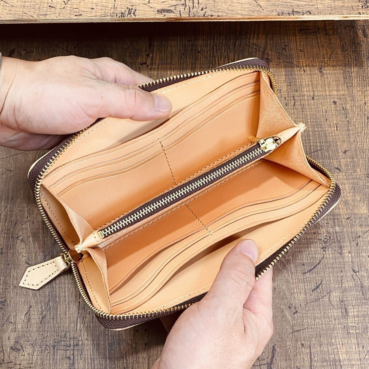 「レザー マイスター クリュ」では、革選びから縫製、コバ塗りまで、すべて熟練の職人たちが一貫して製作。