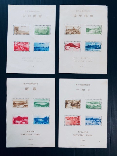 第1次国立公園 小型シート4種 吉野熊野、富士箱根、阿寒、十和田 未使用 タトウなし 難あり品