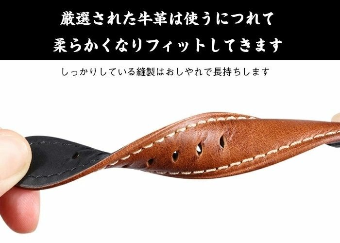 【着け心地抜群】とても高級感があり、触り心地のよい牛革で丁寧に作り上げた交換バンドで、クオリティが高く、スタイリッシュです。革の素材感がしっかりあって、使うにつれて柔らかくなりフィットしてきます。着けた感じも違和感なく手首にしっくり馴染みます。