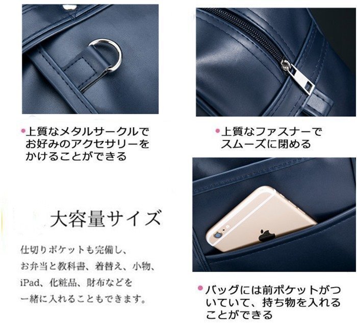 大容量」メインのポケットにはA4の大きさに対応し、仕切りポケットも完備し、お弁当と教科書、着替え、小物などを一緒に入れることもできます。