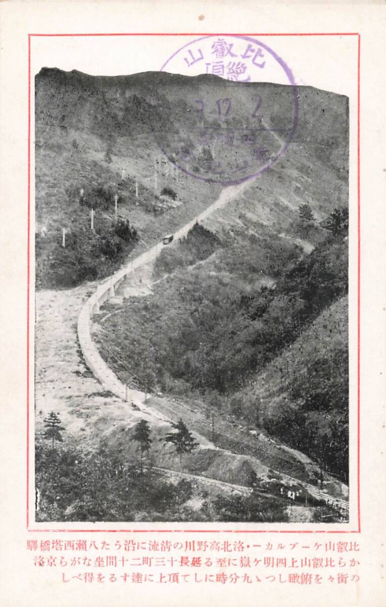 【絵葉書B】比叡山ケーブルカー・洛北高野川の清流沿うた八瀬西塔橋驛から比叡山山上四明ヶ嶽に至る 四明嶽登山記念(3.12.3)スタンプ