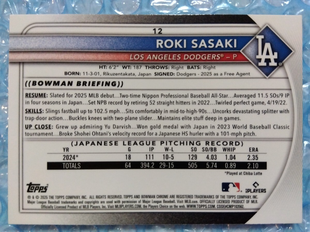 ワールドシリーズでも活躍した、佐々木朗希選手のメジャーリーグでのルーキーカード