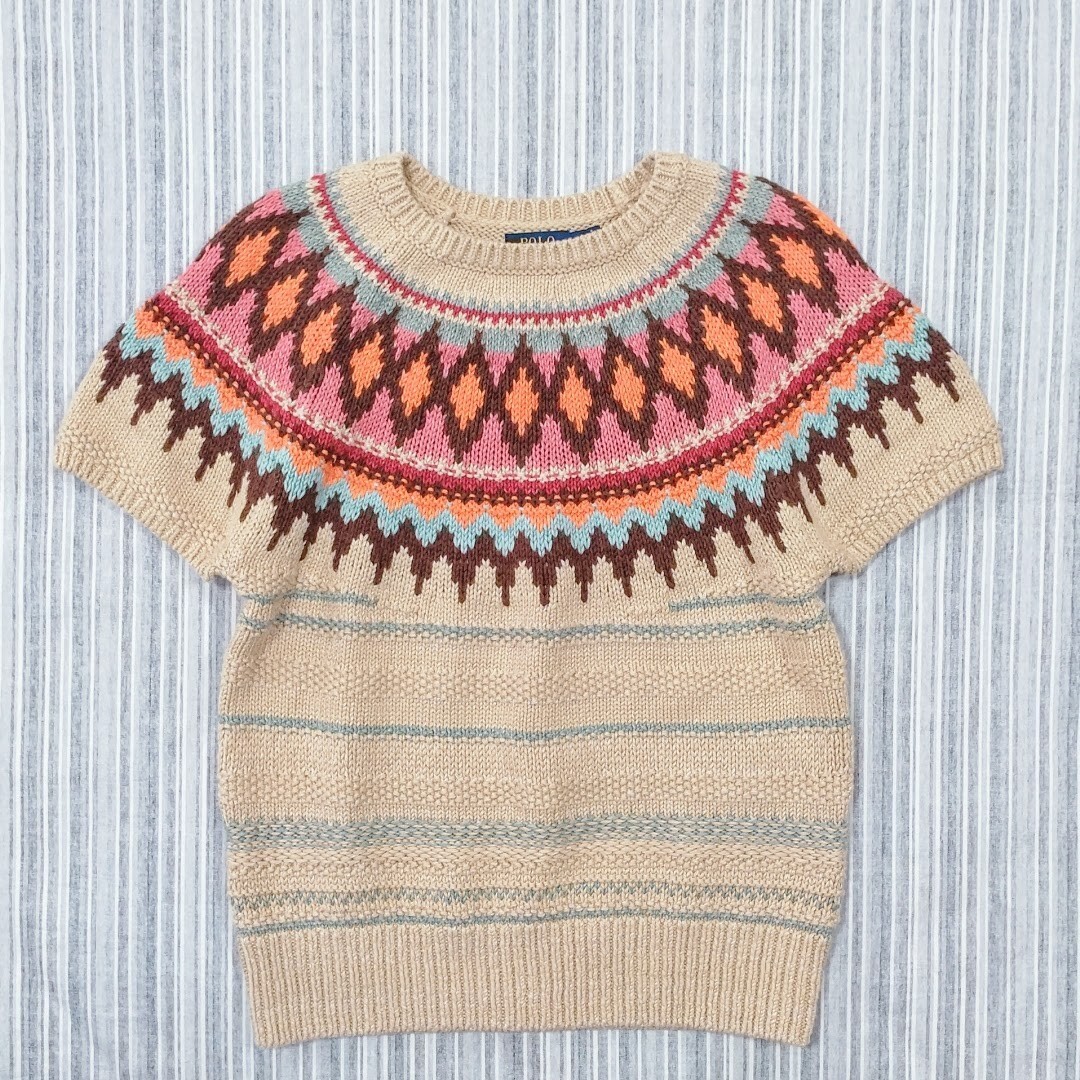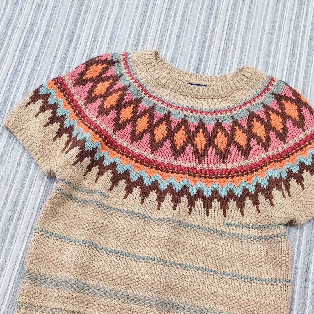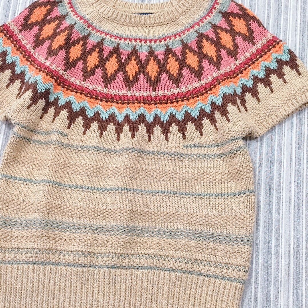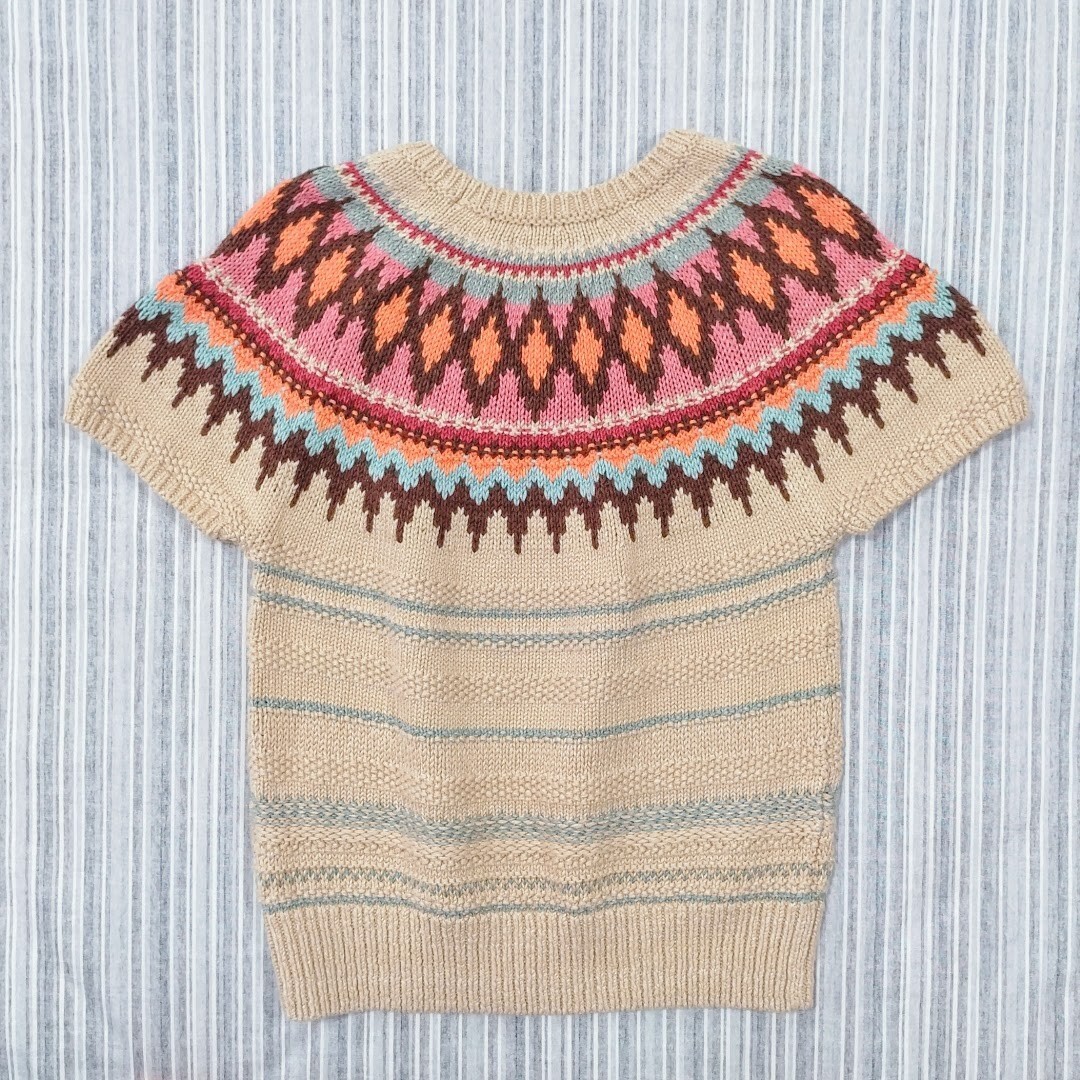 カラフルなジャカード織りのダイヤモンドモチーフがネックラインを縁取り、様々な編み技法が質感と立体感をプラスする半袖セーター。綿と麻をブレンドした厚手の混紡糸には、イタリアと日本製の糸が使用されています。
