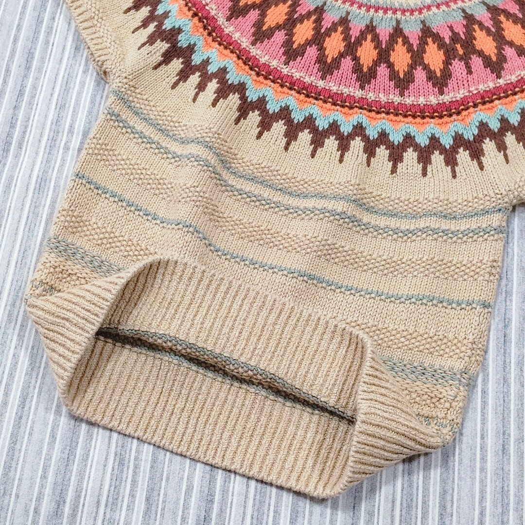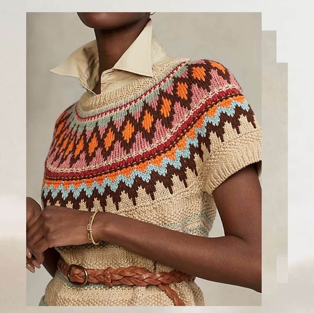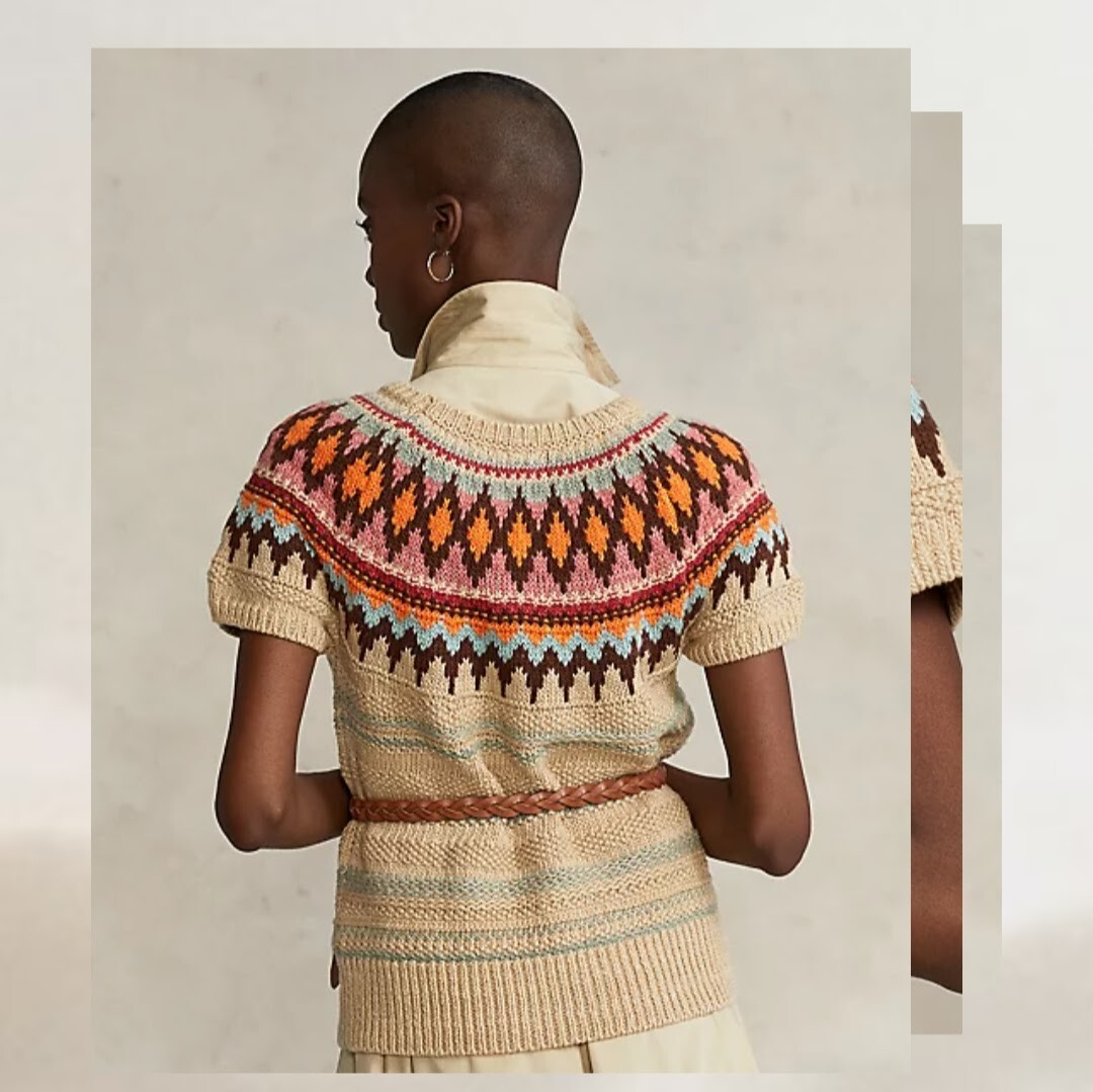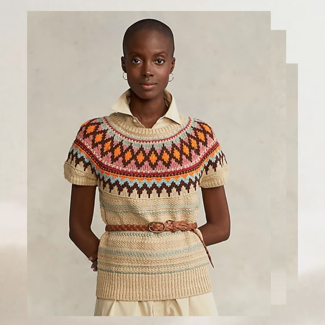 カラフルなジャカード織りのダイヤモンドモチーフがネックラインを縁取り、様々な編み技法が質感と立体感をプラスする半袖セーター。綿と麻をブレンドした厚手の混紡糸には、イタリアと日本製の糸が使用されています。
