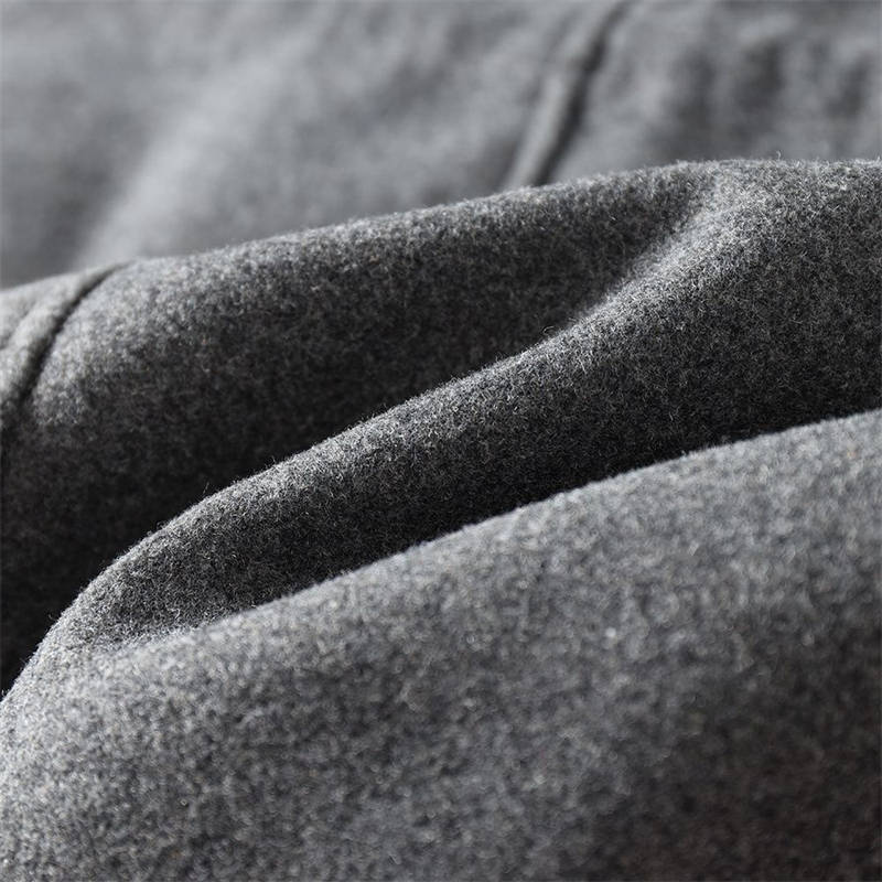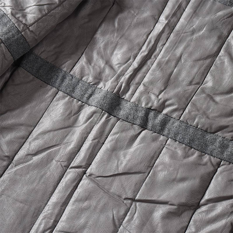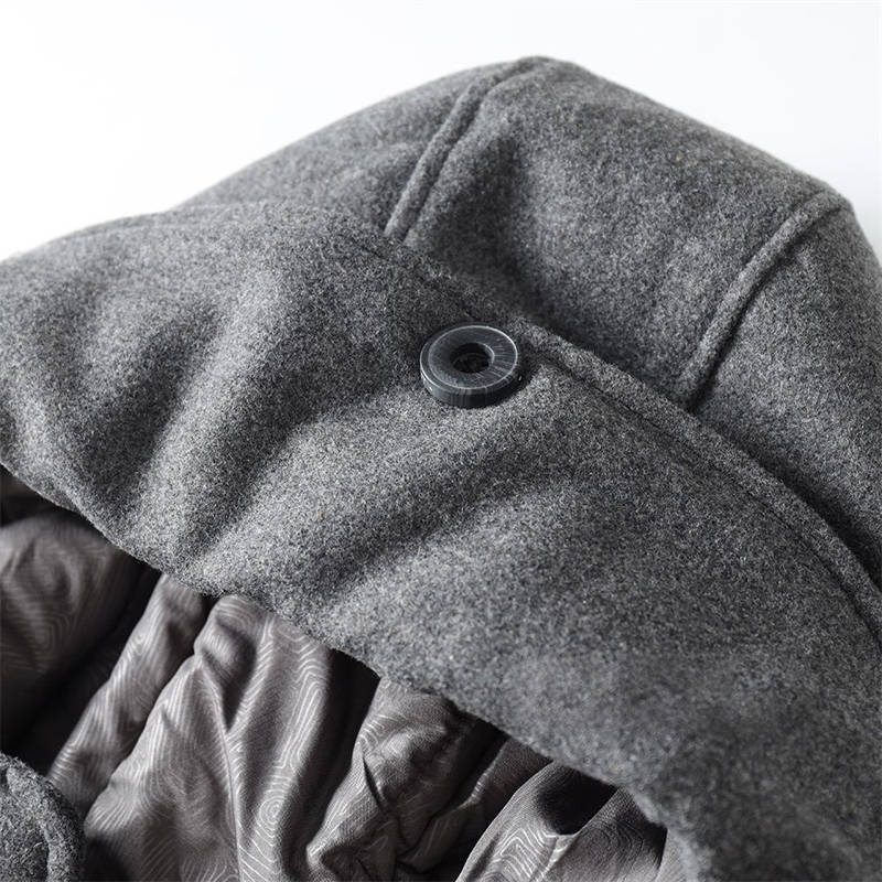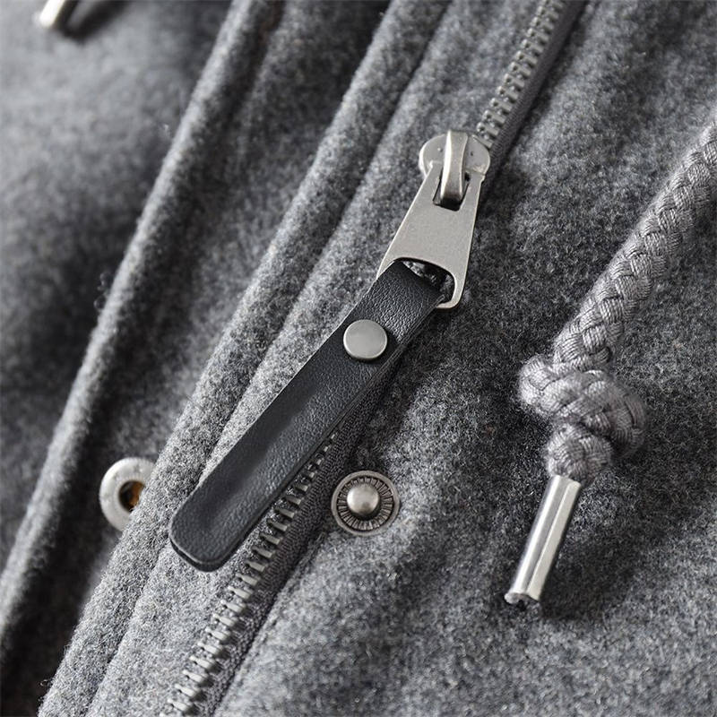 前立ては外側ボタンフラップ+内側ジッパー+風よけストリップの三層構造で防風・保温