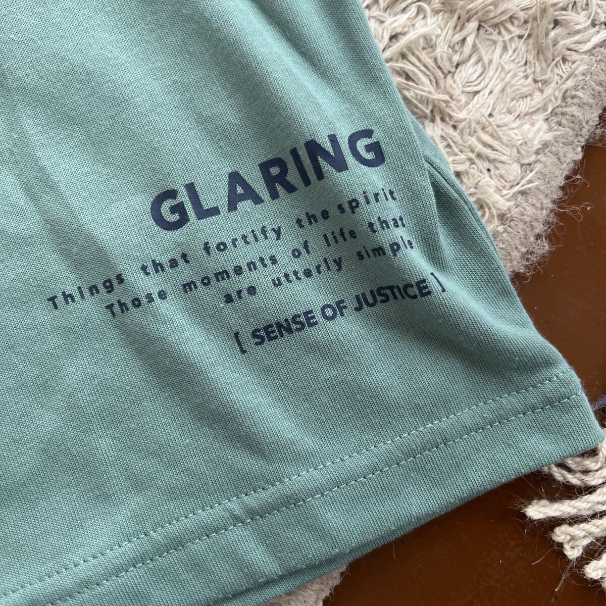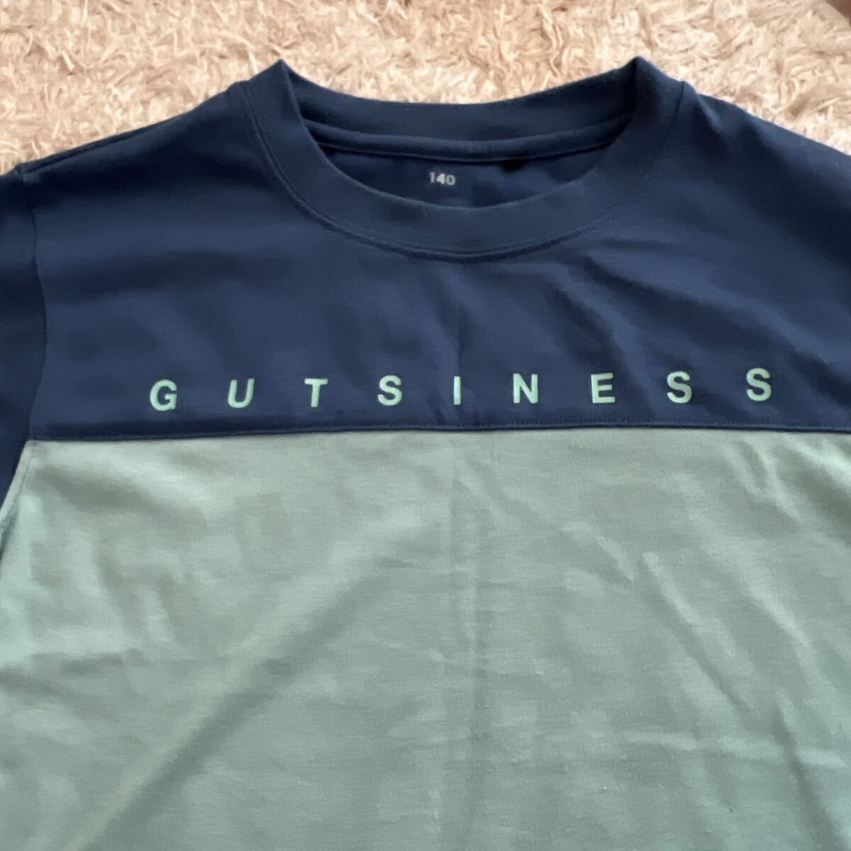 ネイビーとグリーンの配色で、GUTSINNESSとGLARINGのプリントが特徴的なTシャツ。