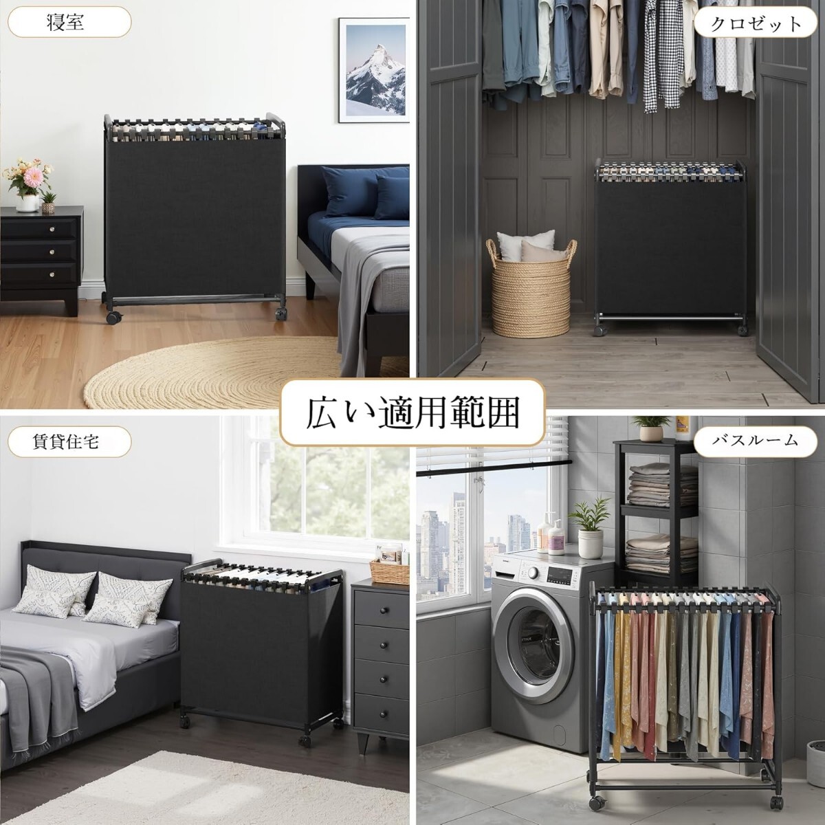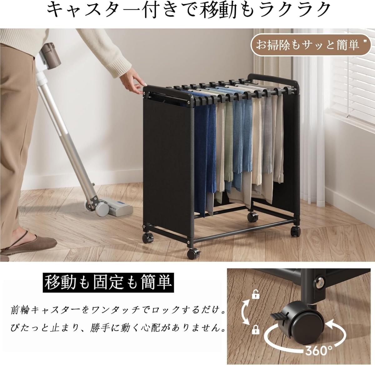 【スムーズに移動、どこでも使える】このパンツハンガーは軽量で耐久性に優れたスチール製。精巧なデザインで家の中のどこでも簡単に移動できます。キャスターには安全ロック機能が付いており、取り付け後はしっかり固定され、不要な滑りを防止します。安定性も高く、クローゼットや収納棚、リビング、寝室など、どこでも使えるので、収納の柔軟性が大幅に向上します。いつでもどこでも衣類を簡単に収納できる便利なアイテムです。