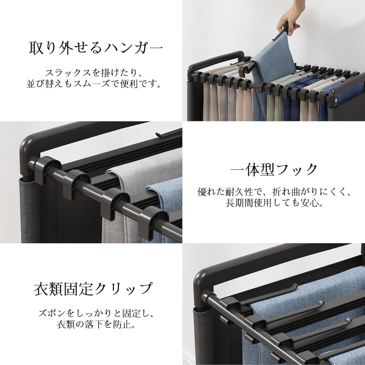 【カバー付きで、部屋をさらに整然と美しく】このパンツハンガーはカバー付きで、掛けたパンツや衣類をしっかり隠せます。整理整頓された清潔感のある空間を作り、無駄な乱雑さを取り除きます。寝室やクローゼット、リビングなど、どんな場所にもぴったり。シンプルでエレガントなデザインが、どんなインテリアにも調和し、部屋を新鮮で整った印象に変えます。
