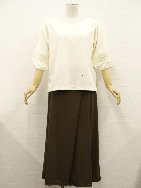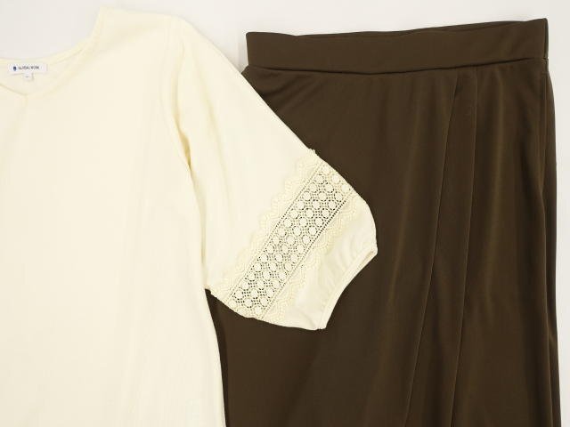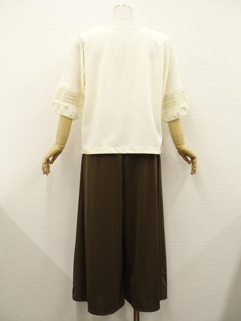 洗える七分袖カットソー+ワイドパンツ コーディネート上下2点セット L相当 クリーム 総柄/ブラウン きれいめ・シンプル系 30代・40代