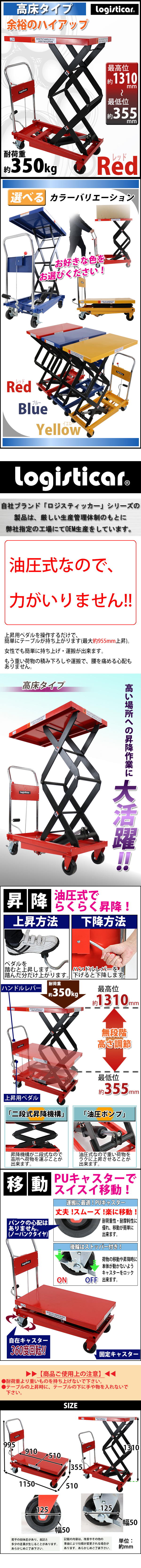 | 商品名 | 送料無料 油圧式昇降台車 リフトカート テーブルカート ハンドリフター 高床タイプ 赤 最高位約1310mm 耐荷重約350kg 昇降台 油圧リフト 油圧台車 テーブルリフト リフティングテーブル 二段式 高揚程 ハイアップ 運搬台車 油圧 台車 レッド liftdaishasy35sr |