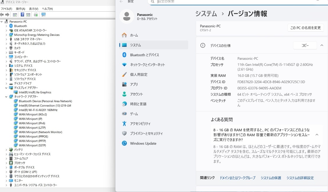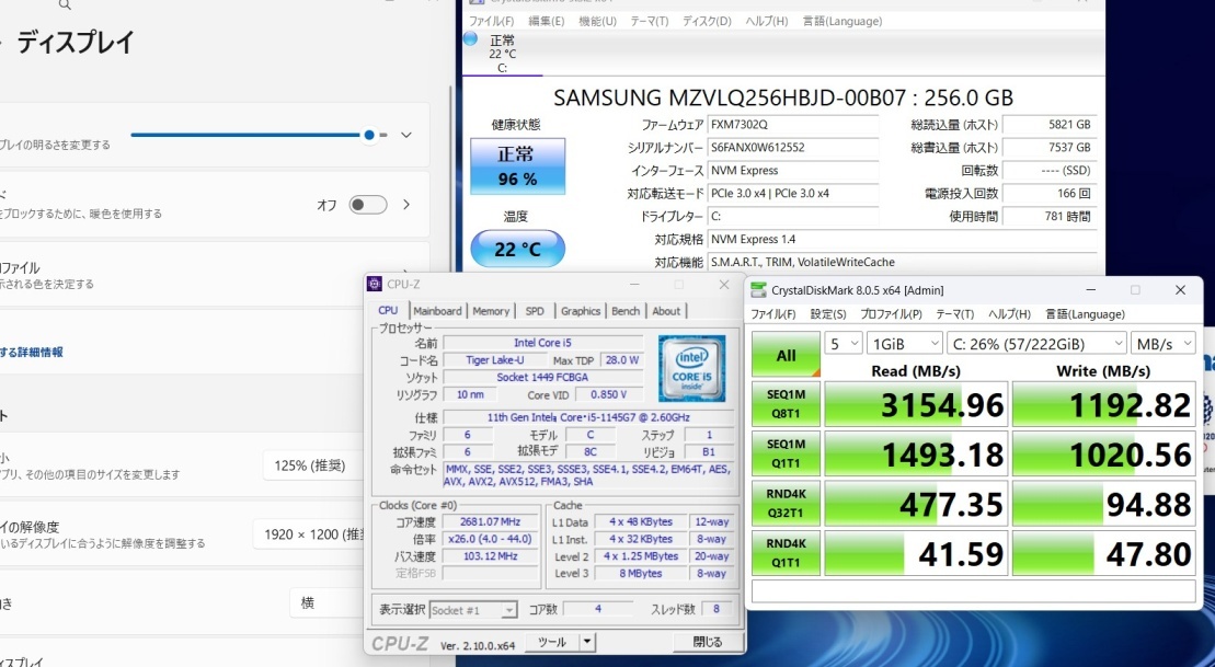 | CPU: 超高速 Intel 卓越性能 第11世代Core i5-1145G7 2.6Ghz、 4コア8スレッド (ターボ・ブースト利用時の最大周波数 4.4GHz) |