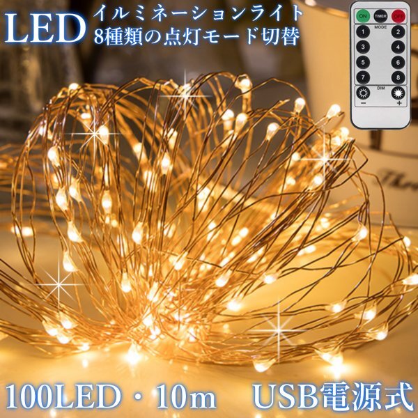 【送料無料】イルミネーション ライト ストリングライト 10m 100 LED USB電源式 リモコン付 点滅モード8パターン クリスマス パーティー インテリア