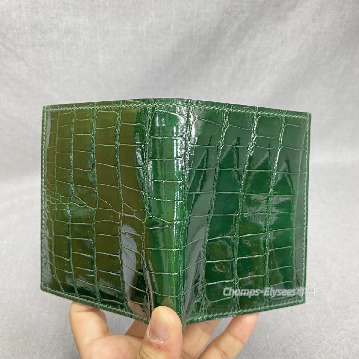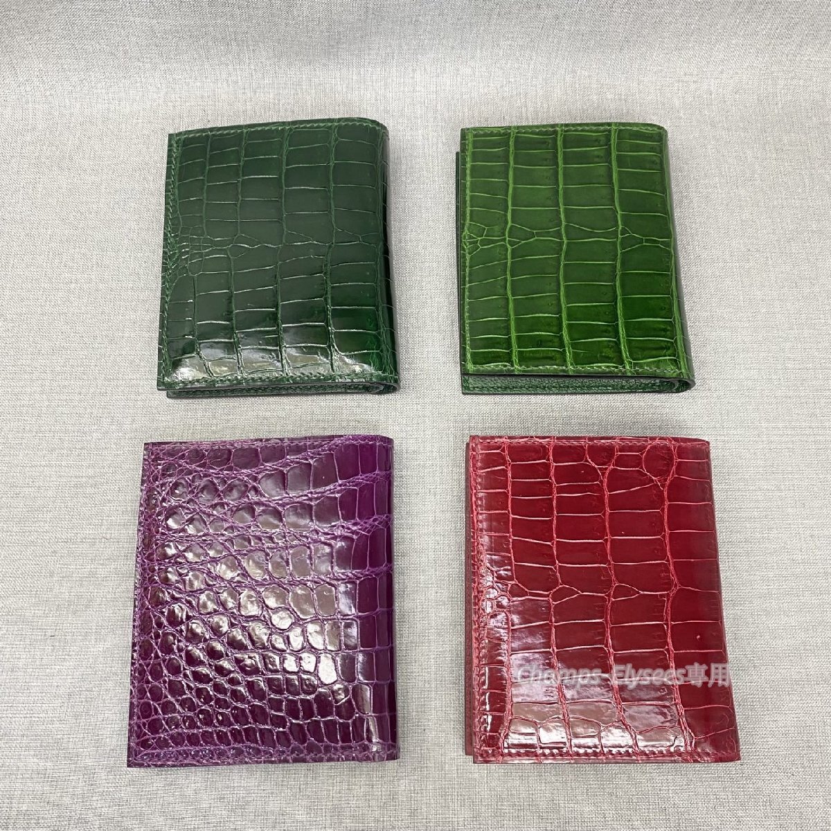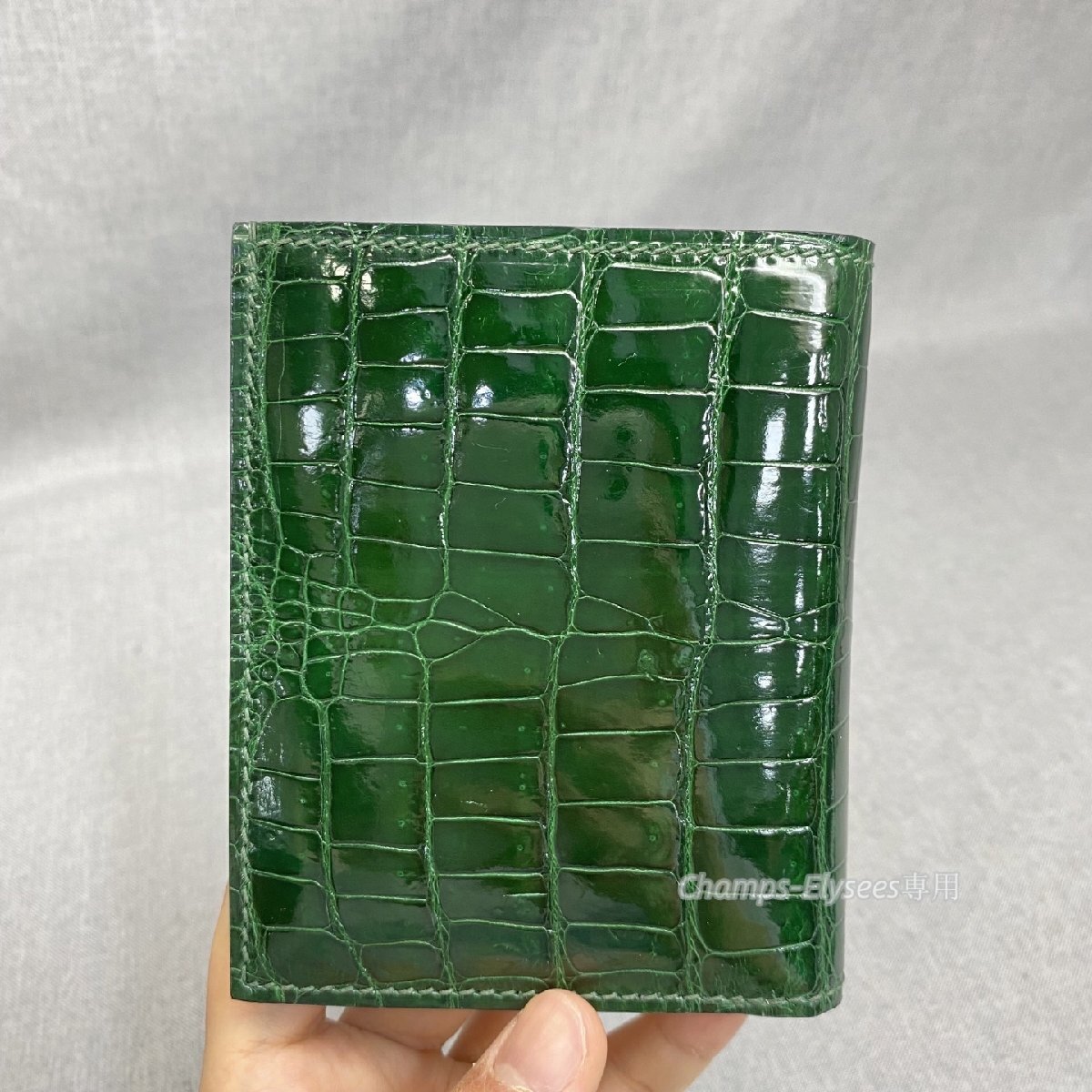 経年変化 貴重品 クロコダイルレザー 本物鰐革 シャイニング加工 紳士財布 二つ折り財布 カード入れ ミニ財布 緑