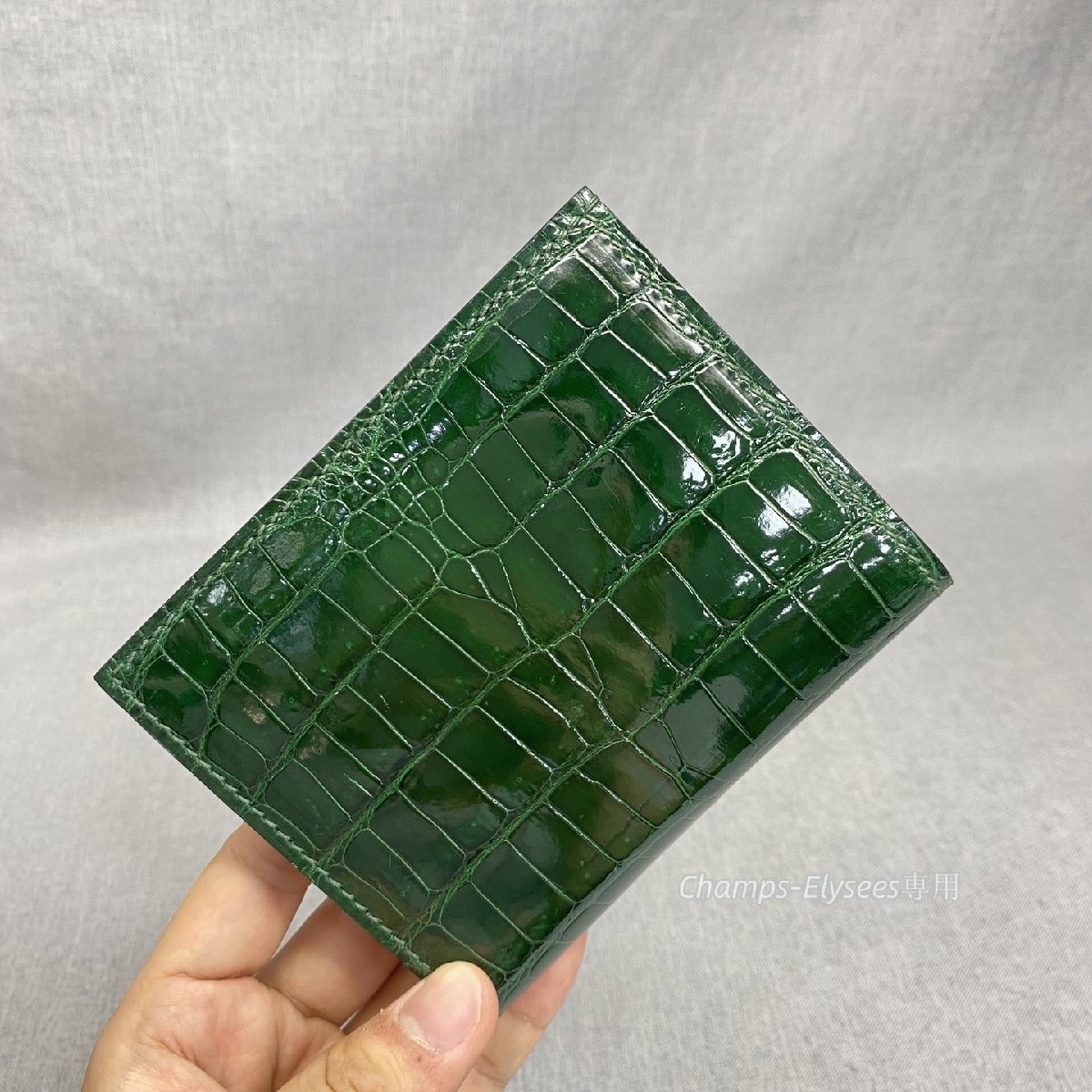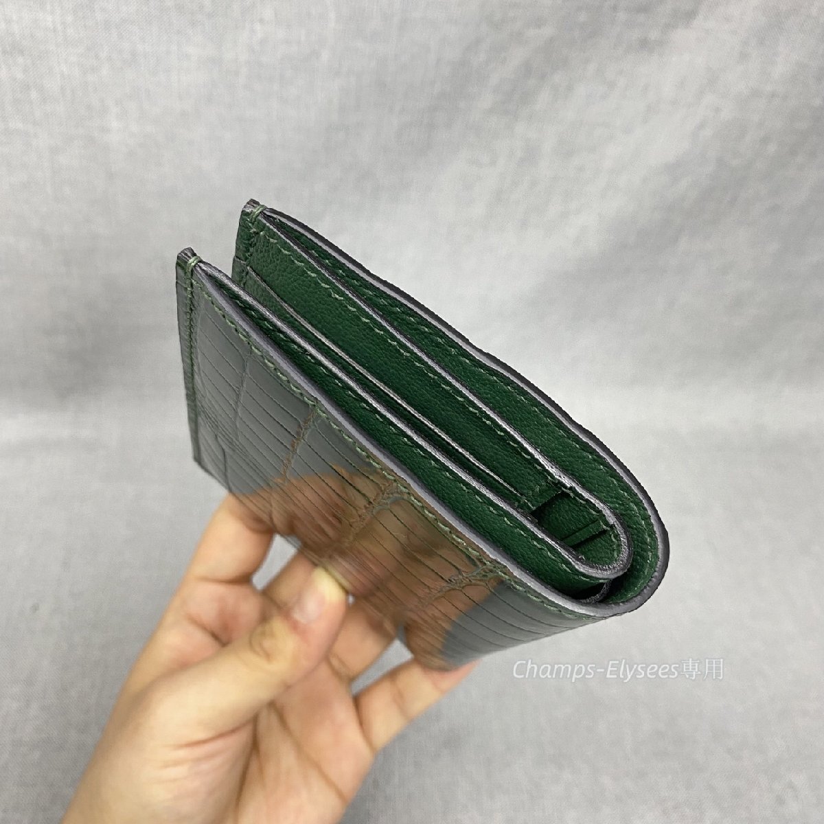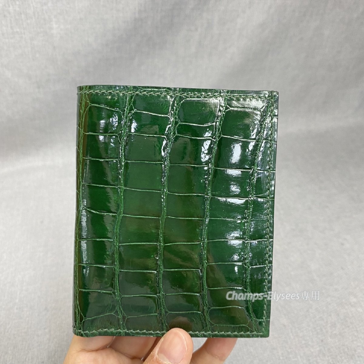 経年変化 貴重品 クロコダイルレザー 本物鰐革 シャイニング加工 紳士財布 二つ折り財布 カード入れ ミニ財布 緑