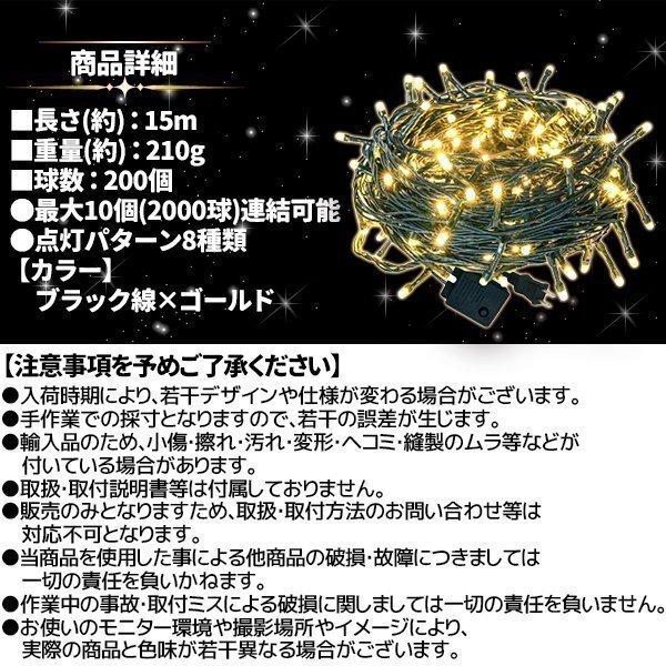 AC式 イルミネーション コンセント 連結可 LED イルミネーションライト ツリー ライト 200球 200灯 15m 黒線 ゴールド