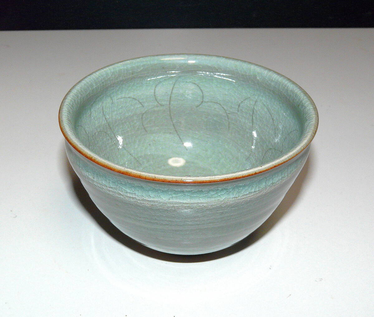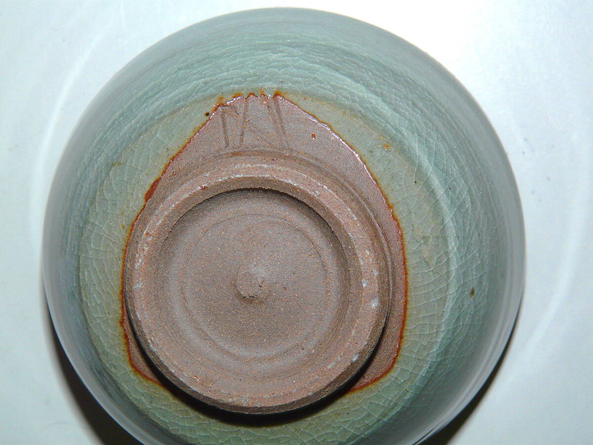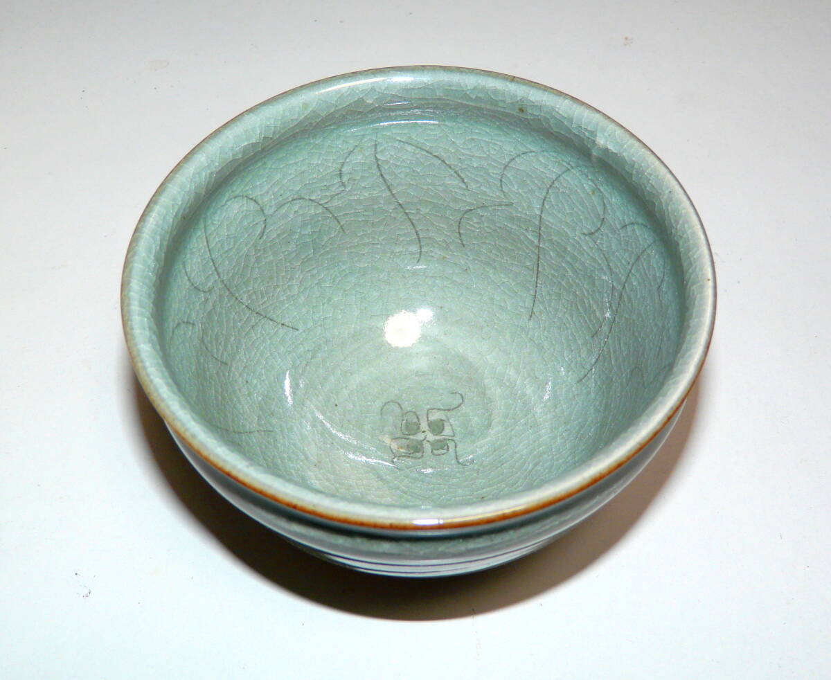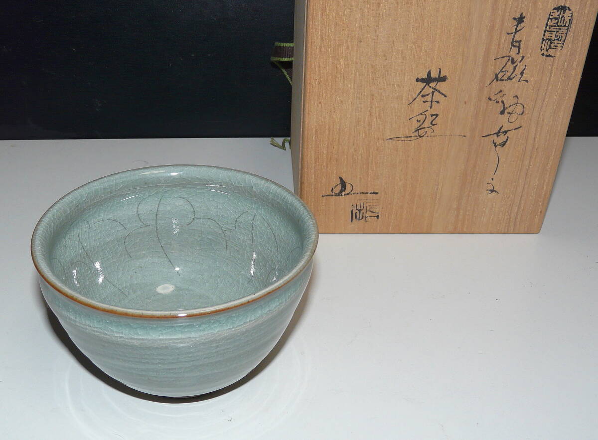 福井県 越前焼 茶器 椿窯 (五島 哲) 『 青磁乳草文 茶碗 』木箱付 1個 (即買いOK)