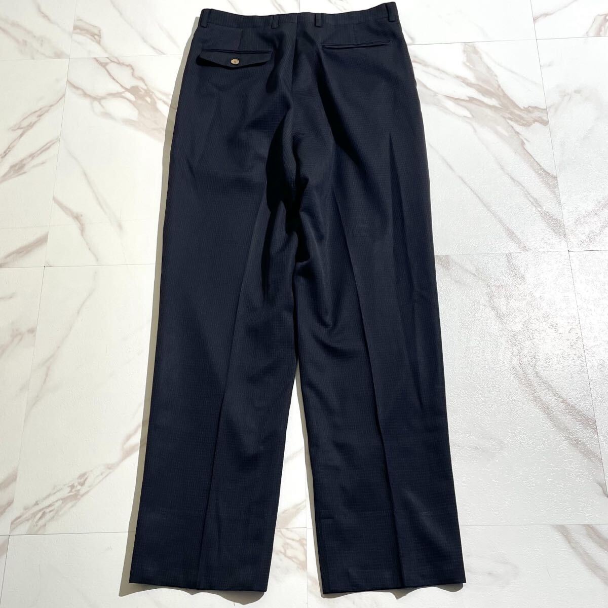 深みのあるネイビー地にさりげないチェック柄が入った、洗練された印象の一着。