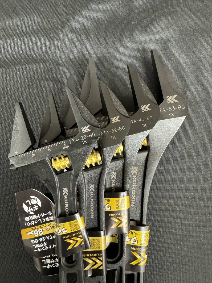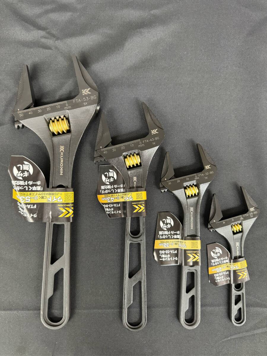 4種類4サイズの四本セット組で出品です!! フジ矢・KUROKIN /FTA-28-BG FTA-32-BG FTA-43-BG FTA-53-BG /ライトモンキー(ギザ無し) 【特長】待望の「ギザ無し」登場。モンキーレンチのラインナップにスタンダードなギザなしタイプを追加。一般的なJIS規格と比べて10%以上ワイドに開口。 【用途】ナットをナメにくく、対象物を傷つけにくい。先端が薄く、長いので狭所やダブルナットにも対応。 ・ボルト・ナットの締め緩めに最適です。 ・水道管、ガス管等への継手の取り付け・取り外しに最適です。 ◆詳細はメーカーホームページをご参照ください。 ◆ノークレーム、ノーリターンでお願い致します。 ◆ラベルなどにダメージや製品に擦り傷などあります、神経質な方の入札はご遠慮下さい ◆落札後24時間以内のご連絡、2日以内にご入金出来る方のみの入札をお願いします。