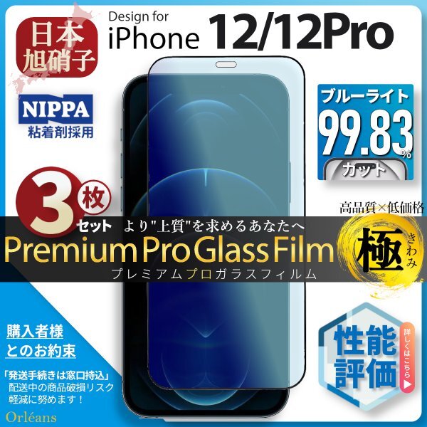 iPhone 12 iPhone 12 Pro ブルーライトカット 強化ガラスフィルム 超得3セット 旭硝子 全面保護 自動吸着 保護フィルム 液晶保護フィルム
