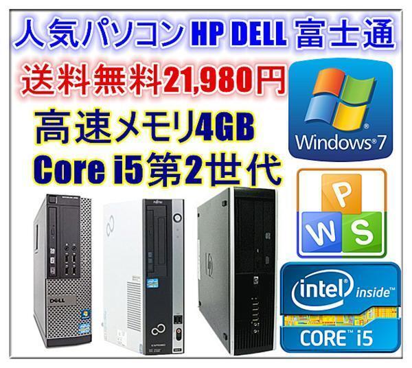 中古パソコン Windows 7 Pro 64bit Office付 人気 HP DELL 富士通 第二世代Core i5 2400-3.10GHz〜 メモリ4G HD250GB DVDドライブ
