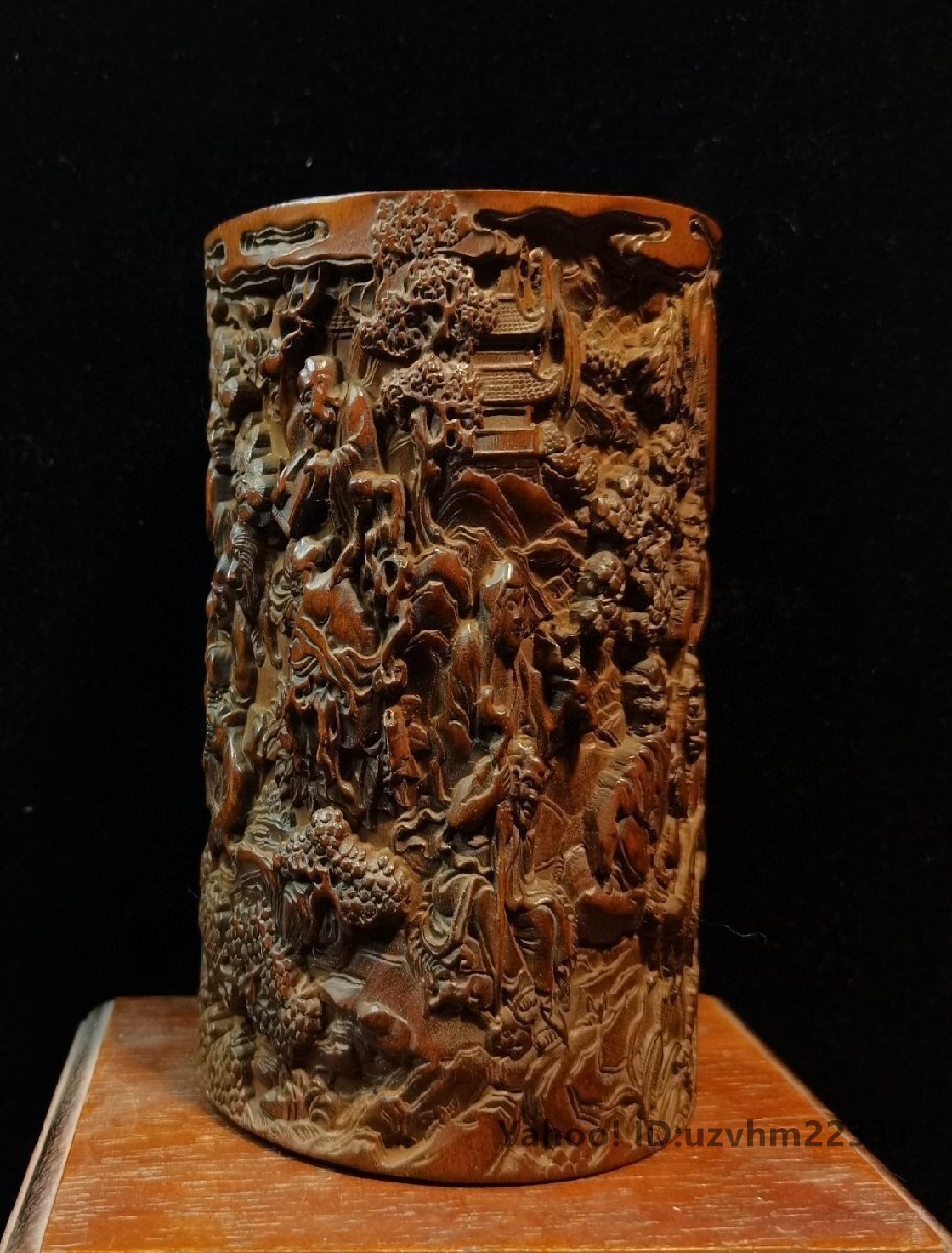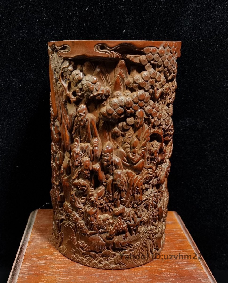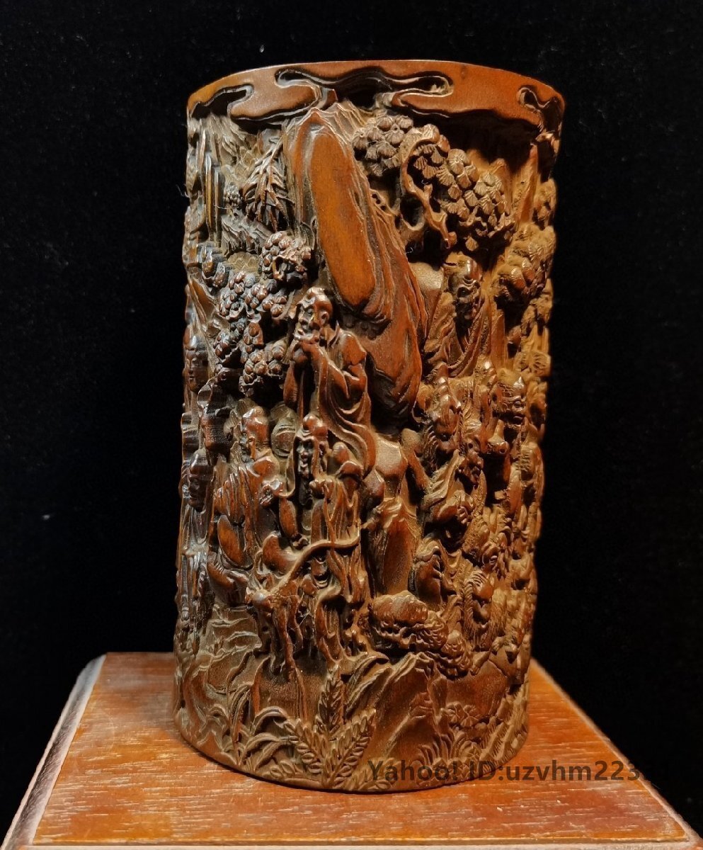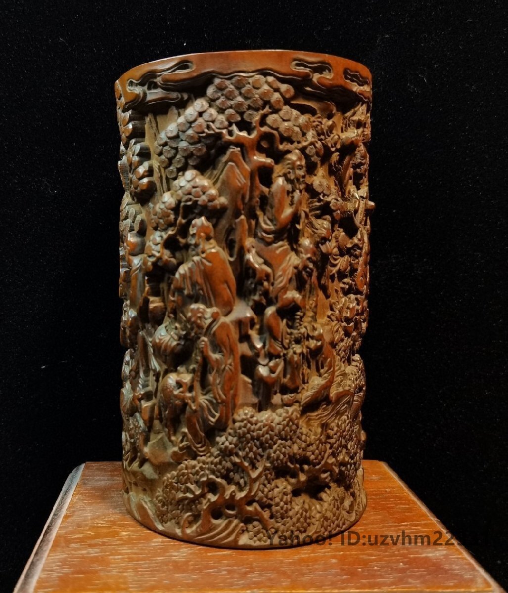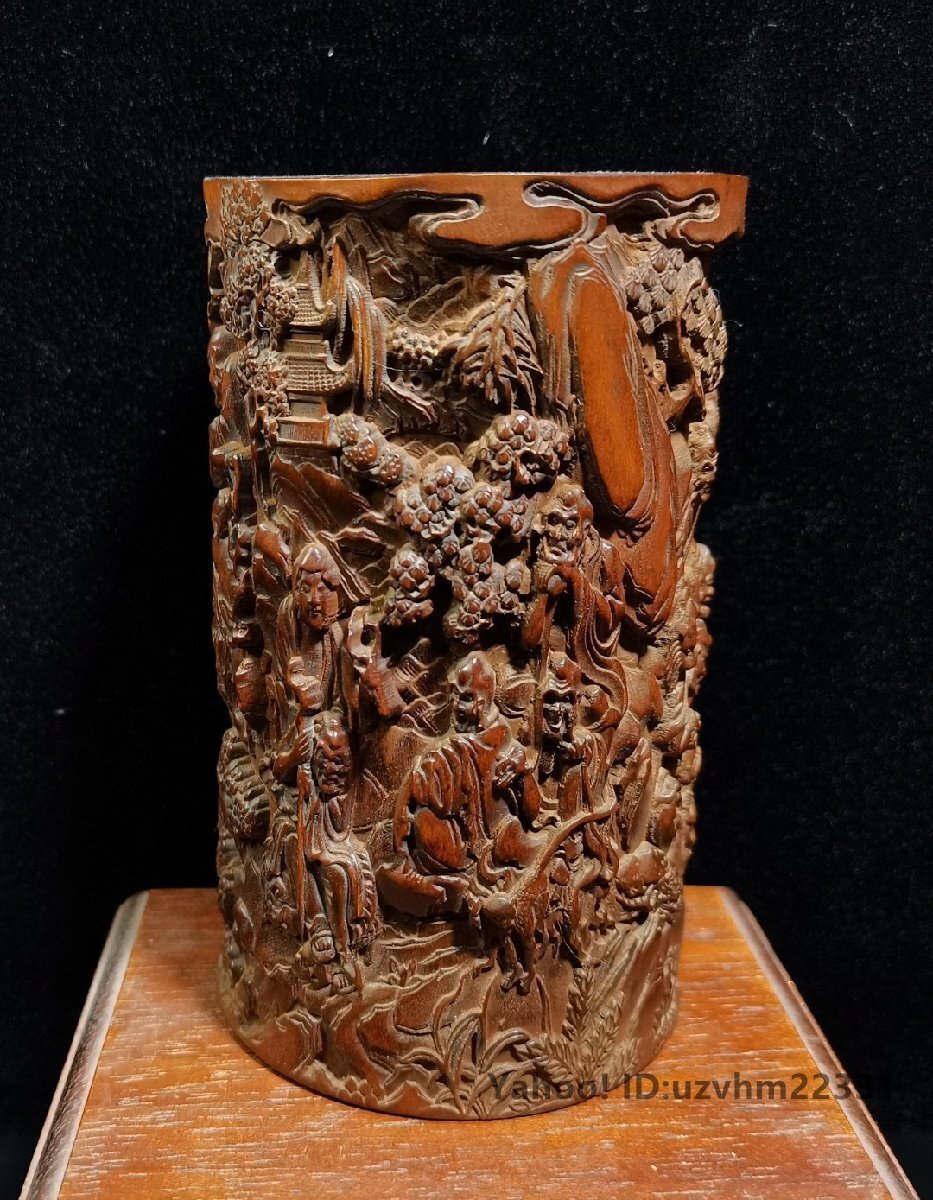 ペン立て 筆筒 筆立 筆桶 手 黄楊木彫刻 十八羅漢 置物 文房用品 書道具 彫刻 書道具 中国美術 收藏