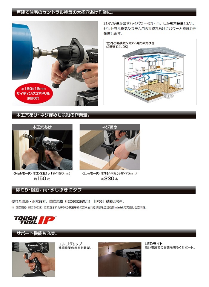 セントラル換気システム用の大径穴あけにパワーと持続力を発揮します。